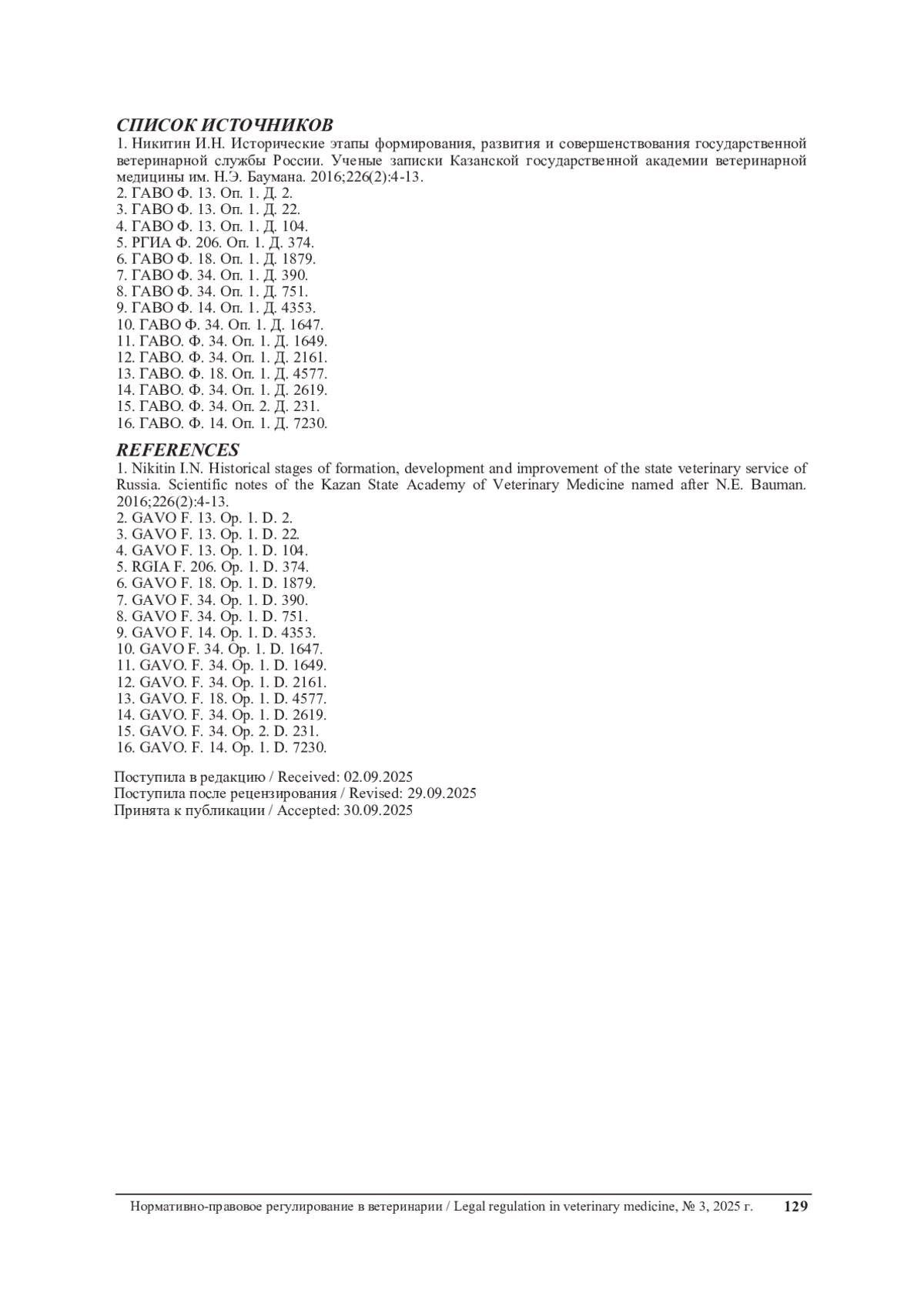 1. Никитин И.Н. Исторические этапы формирования, развития и совершенствования государственной ветеринарной службы России. Ученые записки Казанской государственной академии ветеринарной медицины им. Н.Э. Баумана. 2016;226(2):4-13.