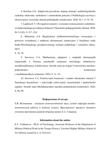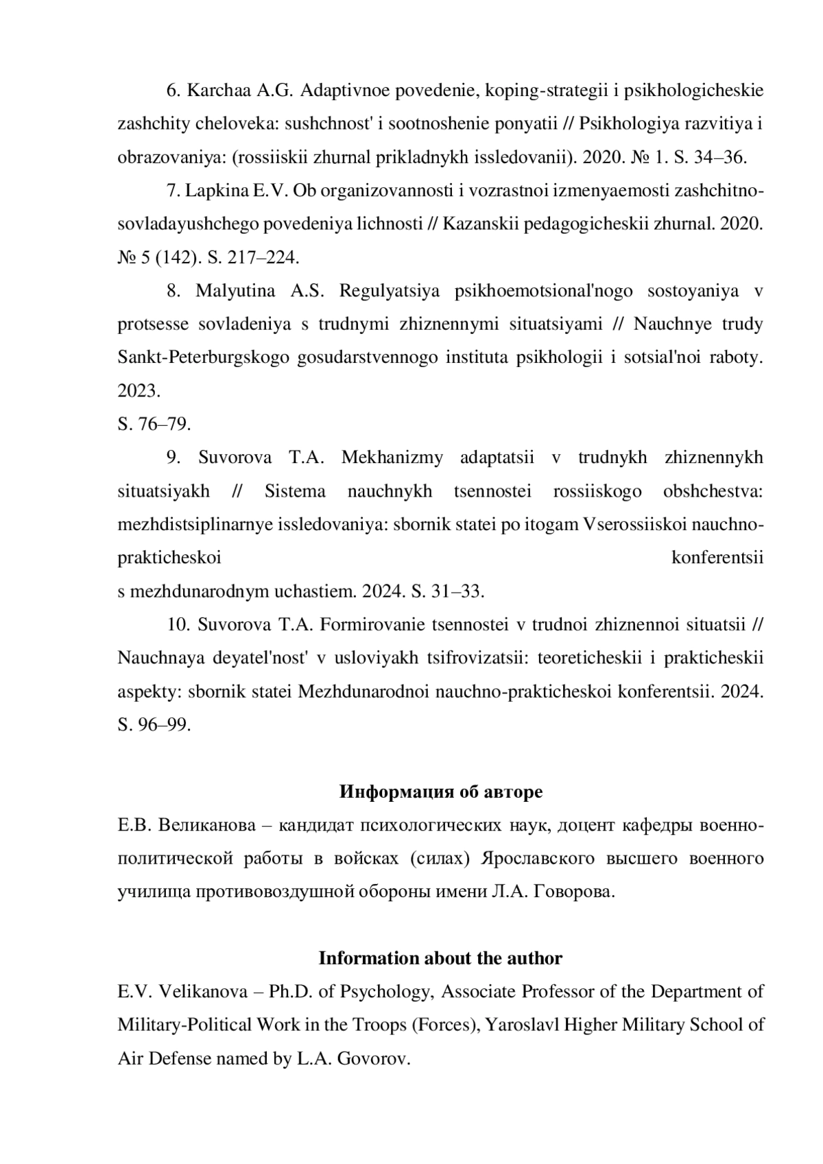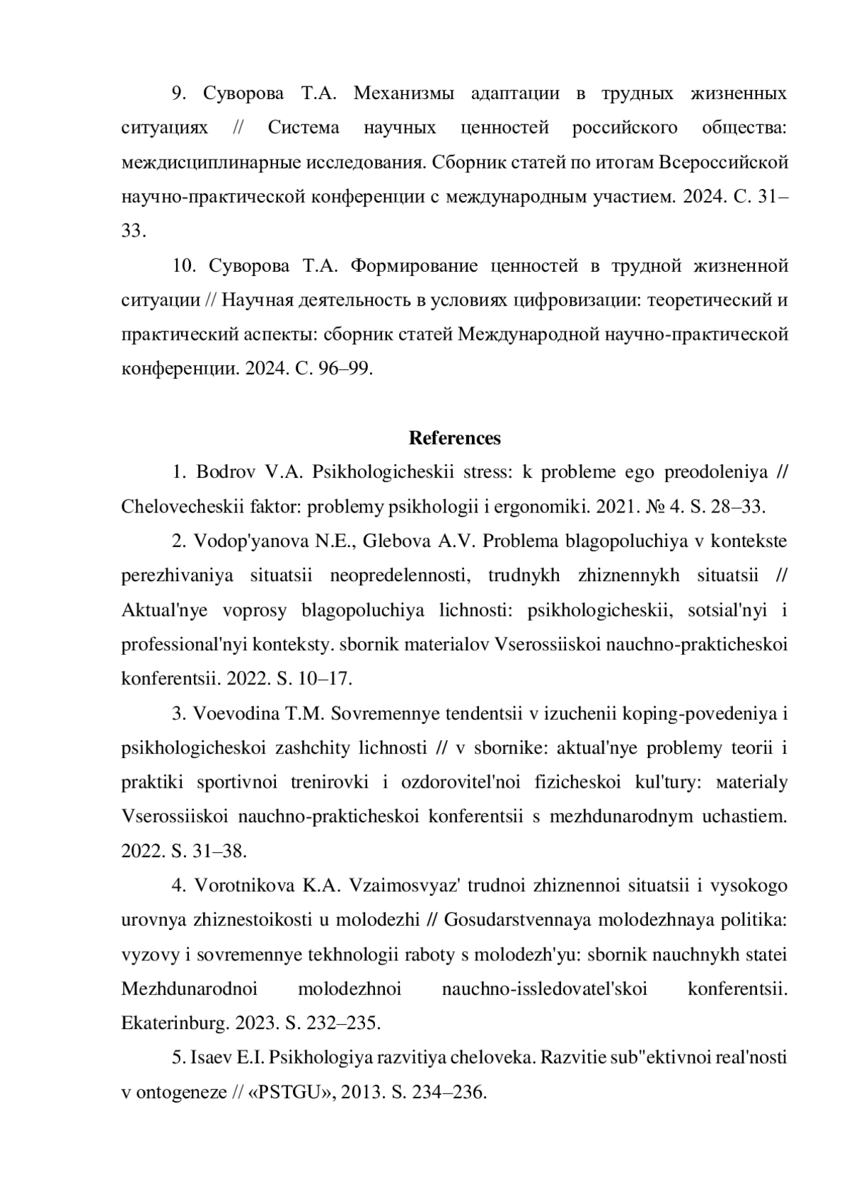 9. Суворова Т.А. Механизмы адаптации в трудных жизненных ситуациях // Система научных ценностей российского общества: междисциплинарные исследования. Сборник статей по итогам Всероссийской научно-практической конференции с международным участием. 2024. С. 31-33. EDN: MEZUTC