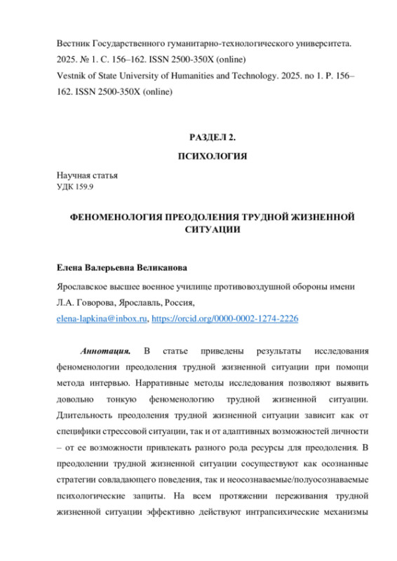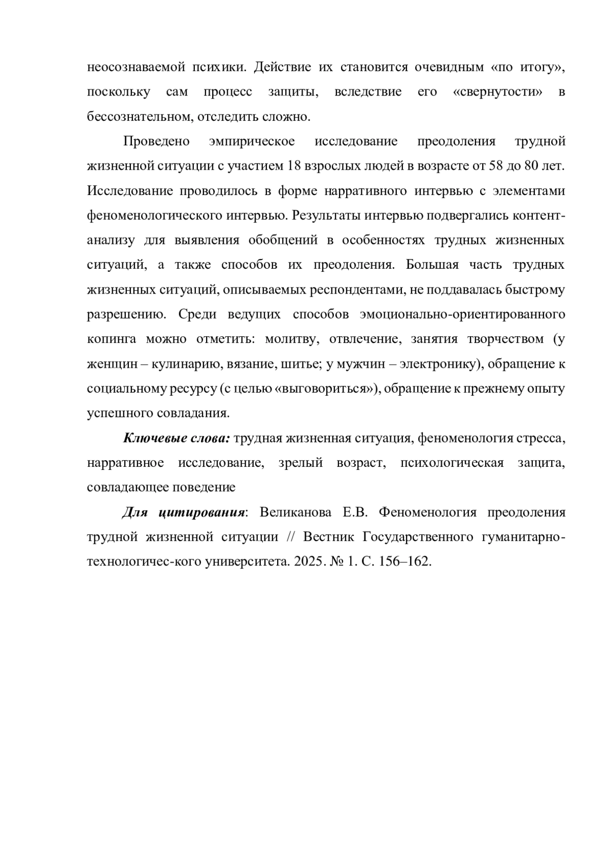 В статье приведены результаты исследования феноменологии преодоления трудной жизненной ситуации при помощи метода интервью. Нарративные методы исследования позволяют выявить довольно тонкую феноменологию трудной жизненной ситуации. Длительность преодоления трудной жизненной ситуации зависит как от специфики стрессовой ситуации, так и от адаптивных возможностей личности - от ее возможности привлекать разного рода ресурсы для преодоления. В преодолении трудной жизненной ситуации сосуществуют как осознанные стратегии совладающего поведения, так и неосознаваемые/полуосознаваемые психологические защиты. На всем протяжении переживания трудной жизненной ситуации эффективно действуют интрапсихические механизмы неосознаваемой психики. Действие их становится очевидным «по итогу», поскольку сам процесс защиты, вследствие его «свернутости» в бессознательном, отследить сложно. Проведено эмпирическое исследование преодоления трудной жизненной ситуации с участием 18 взрослых людей в возрасте от 58 до 80 лет. Исследование проводилось в форме нарративного интервью с элементами феноменологического интервью. Результаты интервью подвергались контент-анализу для выявления обобщений в особенностях трудных жизненных ситуаций, а также способов их преодоления. Большая часть трудных жизненных ситуаций, описываемых респондентами, не поддавалась быстрому разрешению. Среди ведущих способов эмоционально-ориентированного копинга можно отметить: молитву, отвлечение, занятия творчеством (у женщин - кулинарию, вязание, шитье; у мужчин - электронику), обращение к социальному ресурсу (с целью «выговориться»), обращение к прежнему опыту успешного совладания.