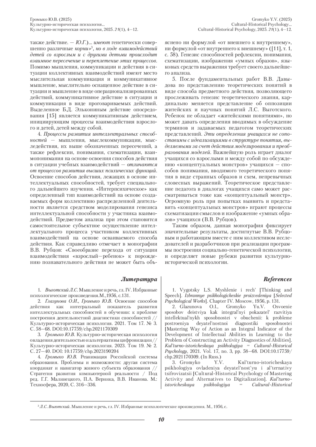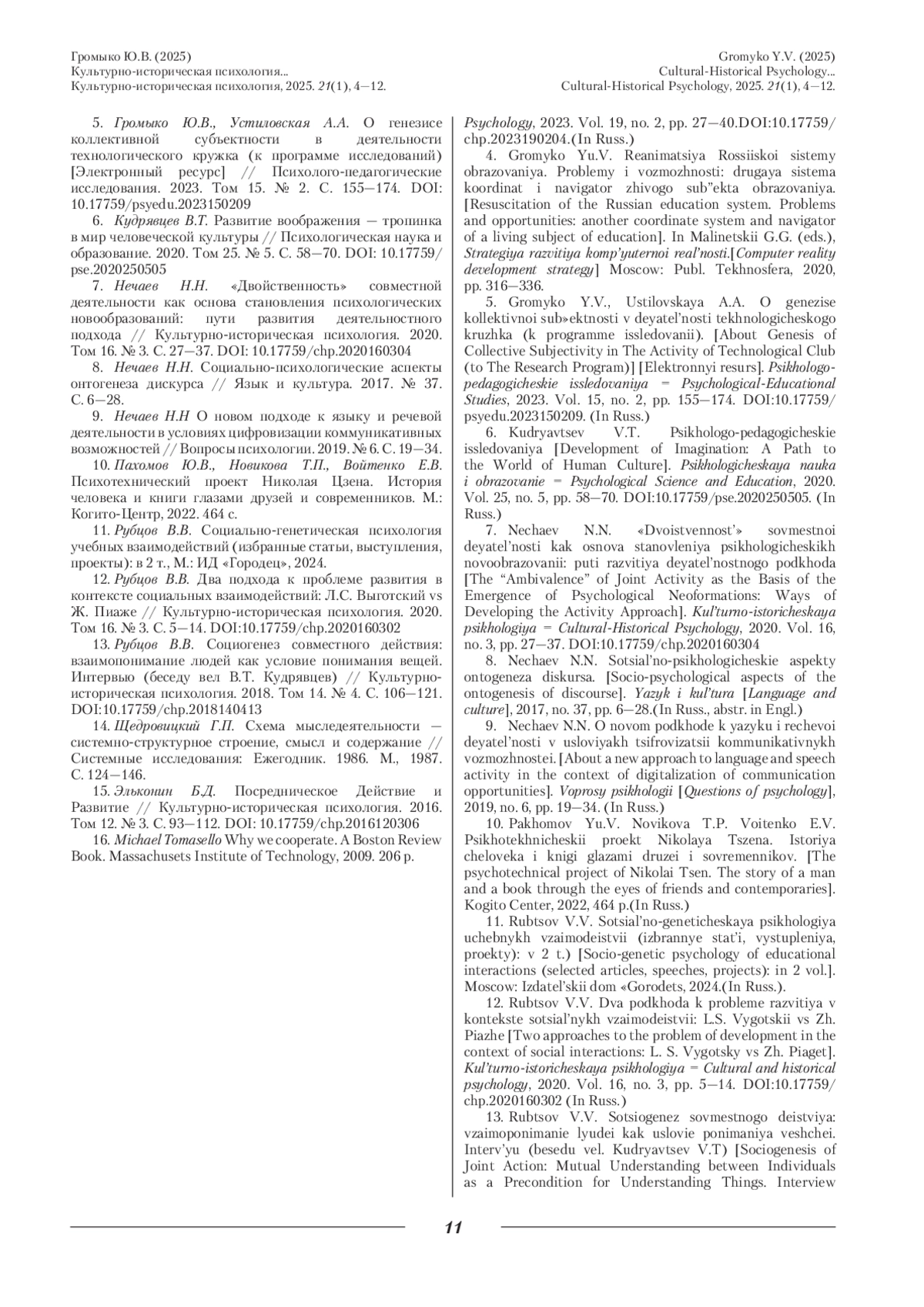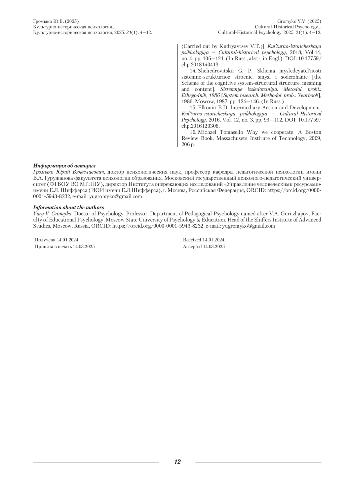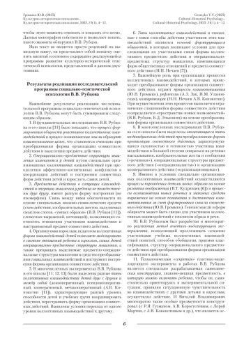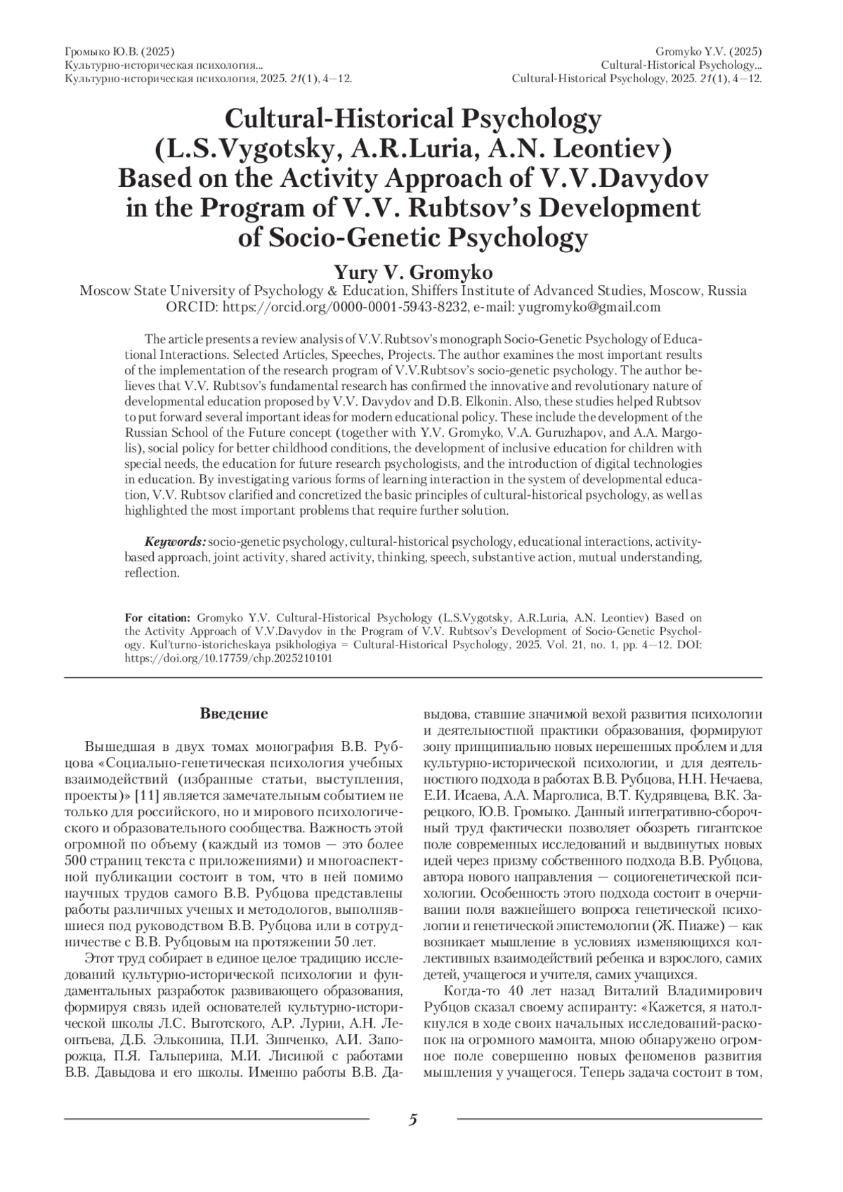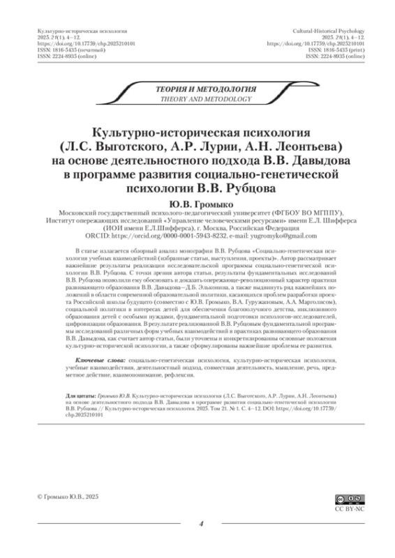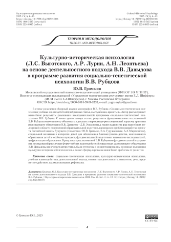ГРОМЫКО Ю. В. КУЛЬТУРНО-ИСТОРИЧЕСКАЯ ПСИХОЛОГИЯ (Л. С. ВЫГОТСКОГО, А. Р. ЛУРИИ, А. Н. ЛЕОНТЬЕВА) НА ОСНОВЕ ДЕЯТЕЛЬНОСТНОГО ПОДХОДА В. В. ДАВЫДОВА В ПРОГРАММЕ РАЗВИТИЯ СОЦИАЛЬНО-ГЕНЕТИЧЕСКОЙ ПСИХОЛОГИИ В. В. РУБЦОВА // КУЛЬТУРНО-ИСТОРИЧЕСКАЯ ПСИХОЛОГИЯ. 2025. № 1, ТОМ 21