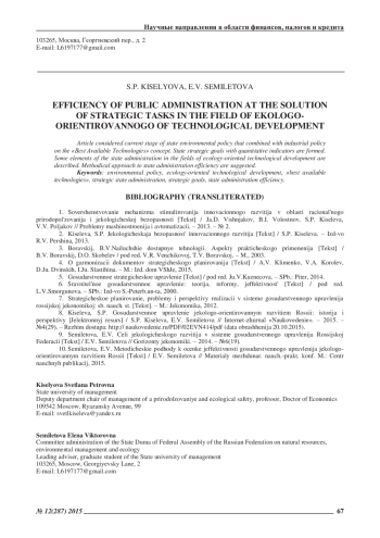 8. Киселева, С.П. Государственное управление эколого-ориентированным развитием России: история и перспективы /С.П. Киселева, Е.В. Семилетова//Интернет-журнал «Науковедение». -2015. -№4(29). -Режим доступа: http://naukovedenie.ru/PDF/02EVN414/pdf (дата обращения 20.10.2015).
