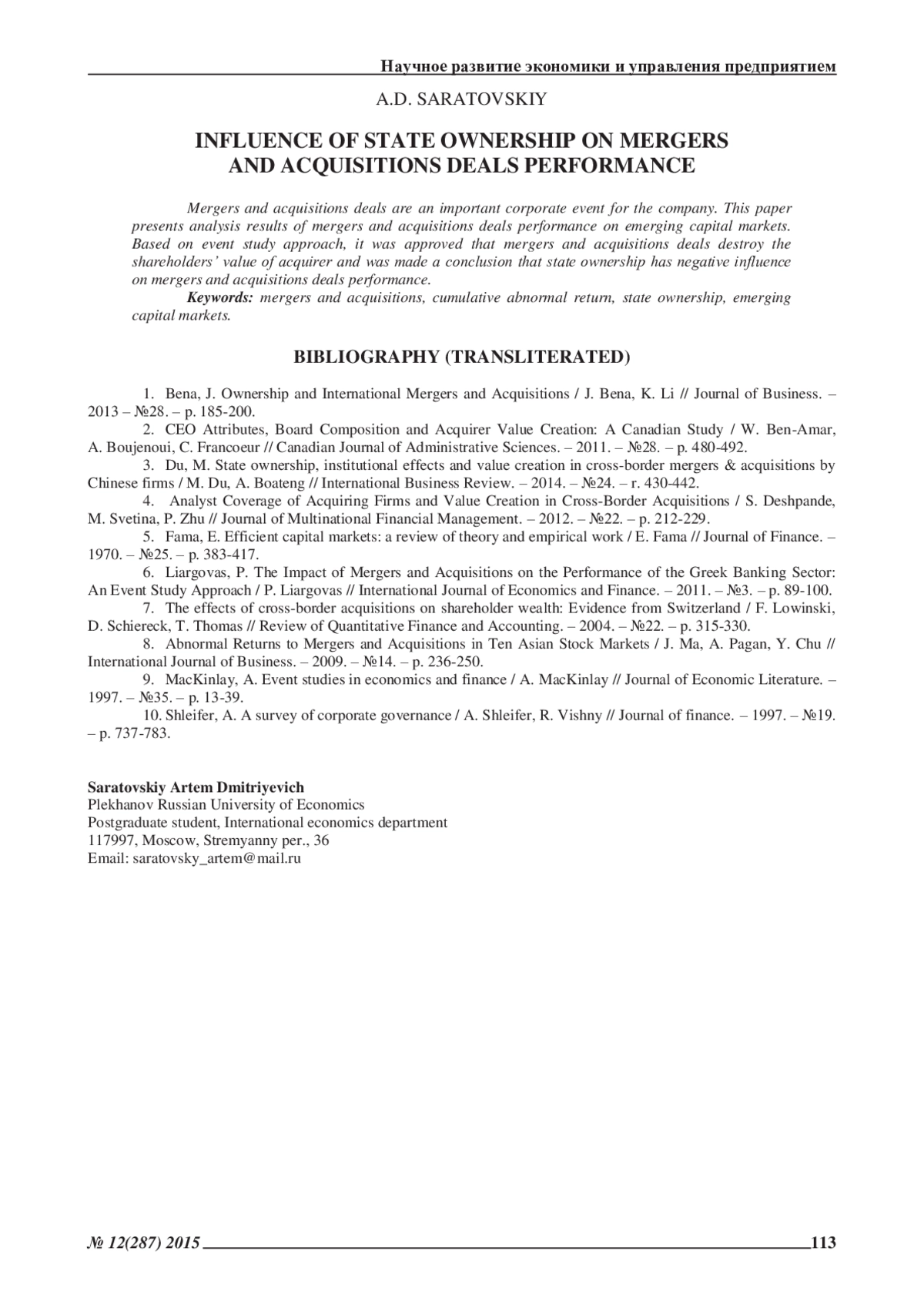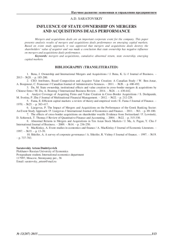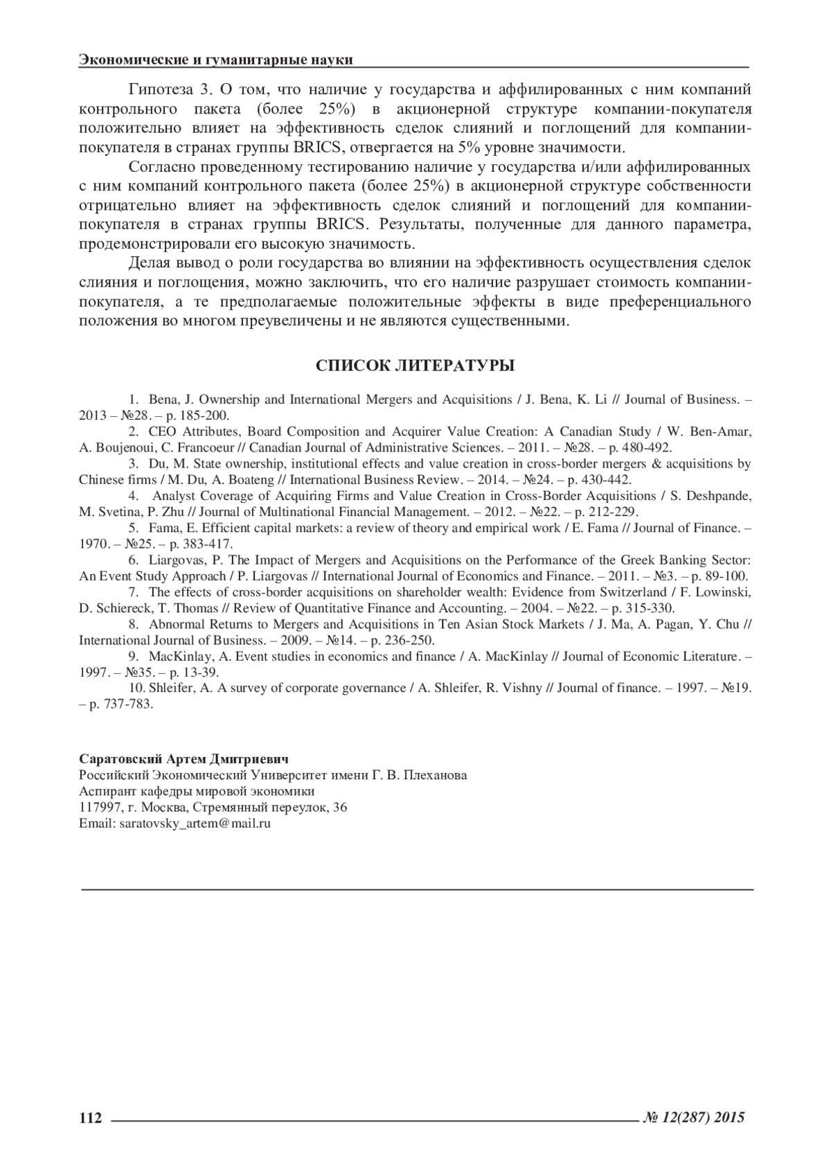1. Bena, J. Ownership and International Mergers and Acquisitions / J. Bena, K. Li // Journal of Business. - 2013 - №28. - p. 185-200.