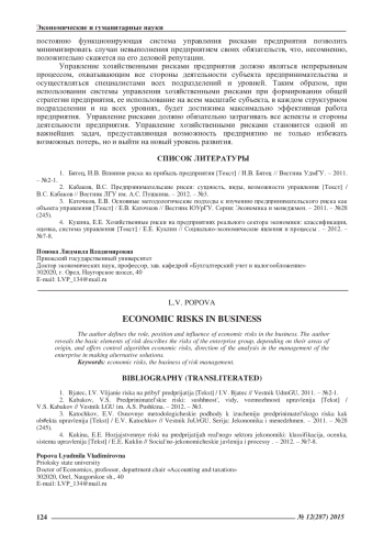 1. Бятец, И.В. Влияние риска на прибыль предприятия [Текст] / И.В. Бятец // Вестник УдмГУ. - 2011. - №2-1. EDN: NECYVZ