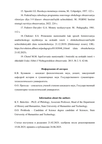 19. Чореф М.М. Использование нумизматики и бонистики на уроках истории в школах Урала и Сибири // Нижегородское образование. 2015. № 2. С. 62-66. EDN: UQDYCT