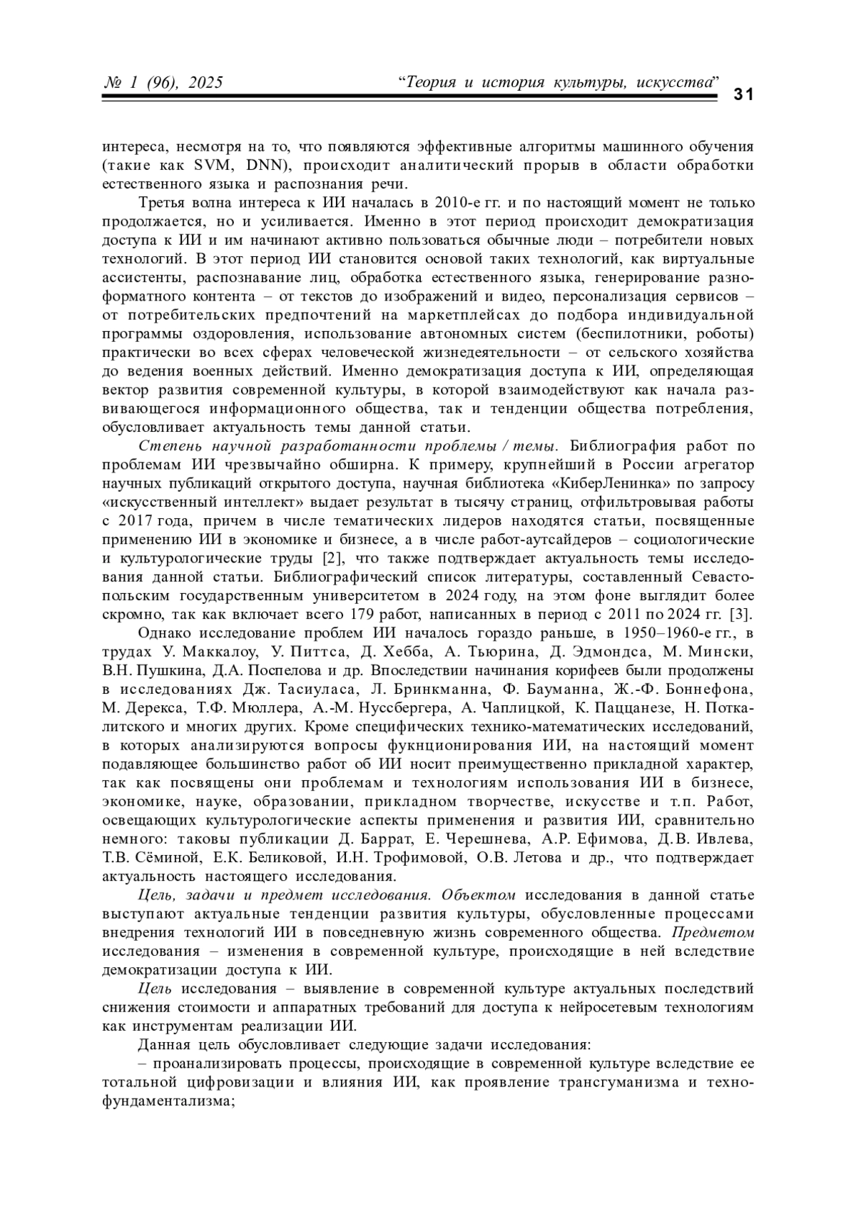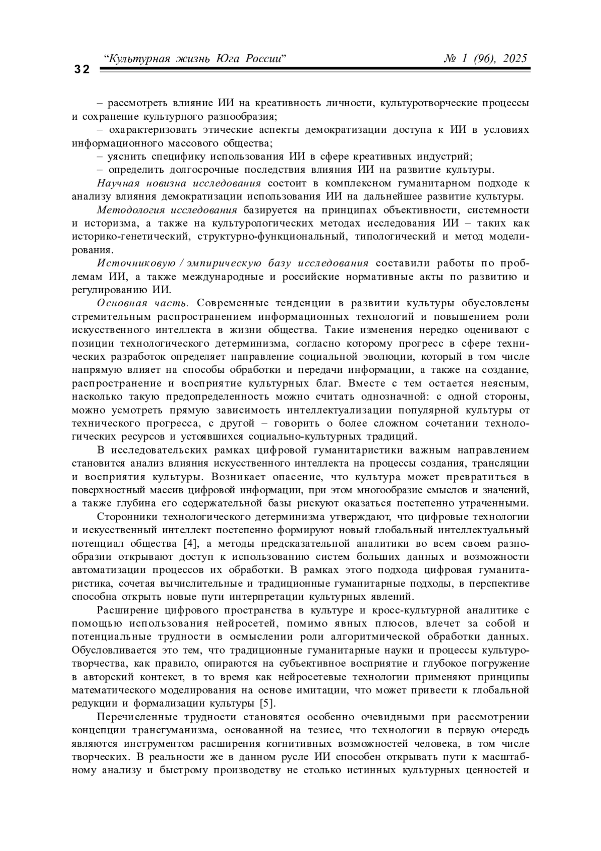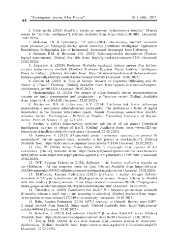 5. Атреянов А. Профессор Сколтеха рассказал, какую угрозу для культуры создает искусственный интеллект. URL: https://sk.ru/news/professor-skolteha-rasskazal-kakuyu-ugrozu-dlya-kultury-sozdaet-iskusstvennyy-intellekt (дата обращения: 20.02.2025).