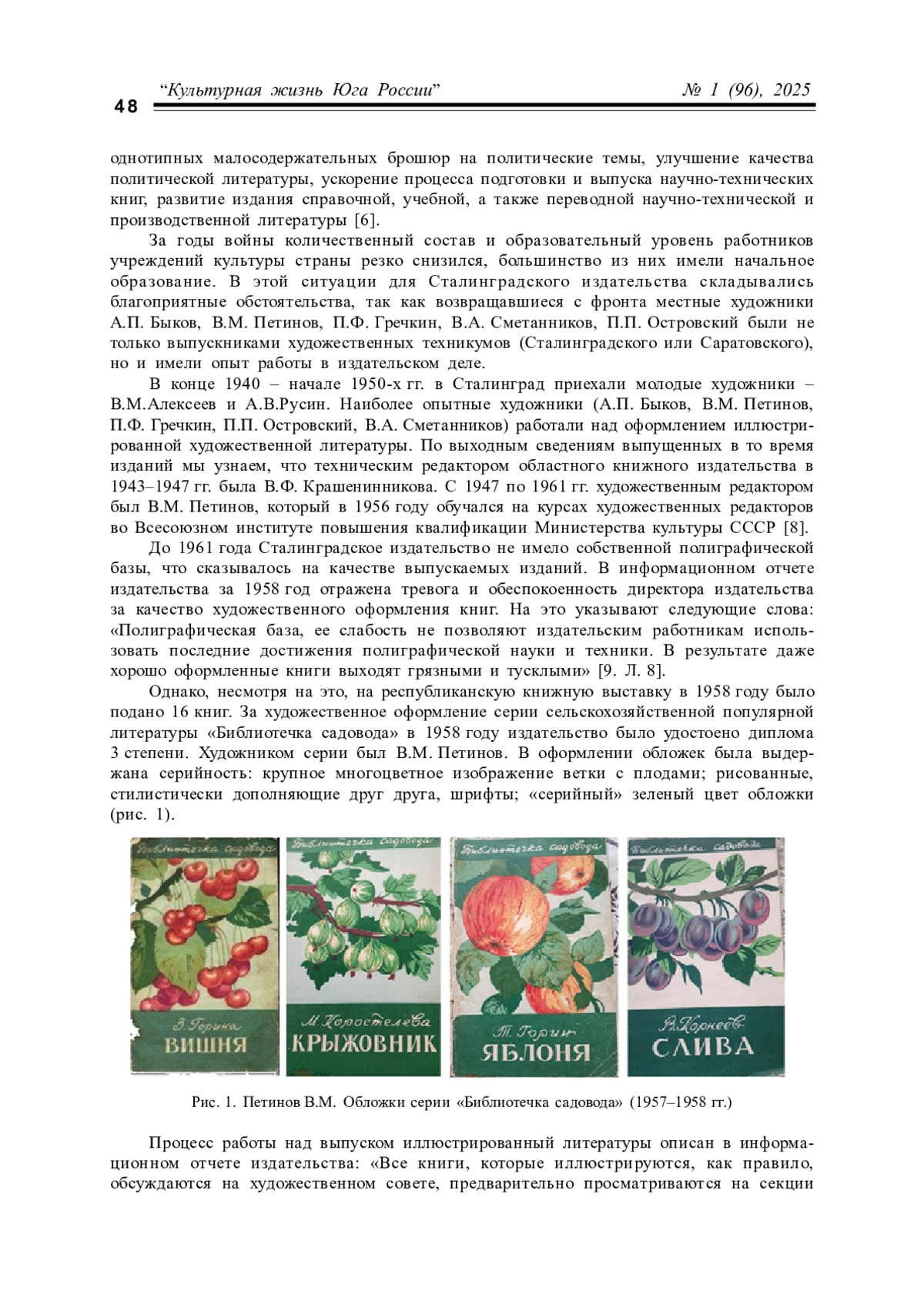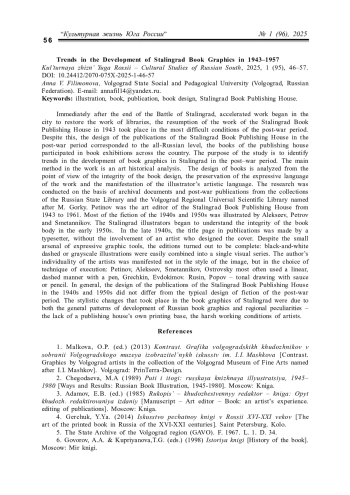 ФИЛИМОНОВА А. В. ТЕНДЕНЦИИ РАЗВИТИЯ СТАЛИНГРАДСКОЙ КНИЖНОЙ ГРАФИКИ В 1943-1957 ГГ // КУЛЬТУРНАЯ ЖИЗНЬ ЮГА РОССИИ. 2025. № 1 (96)