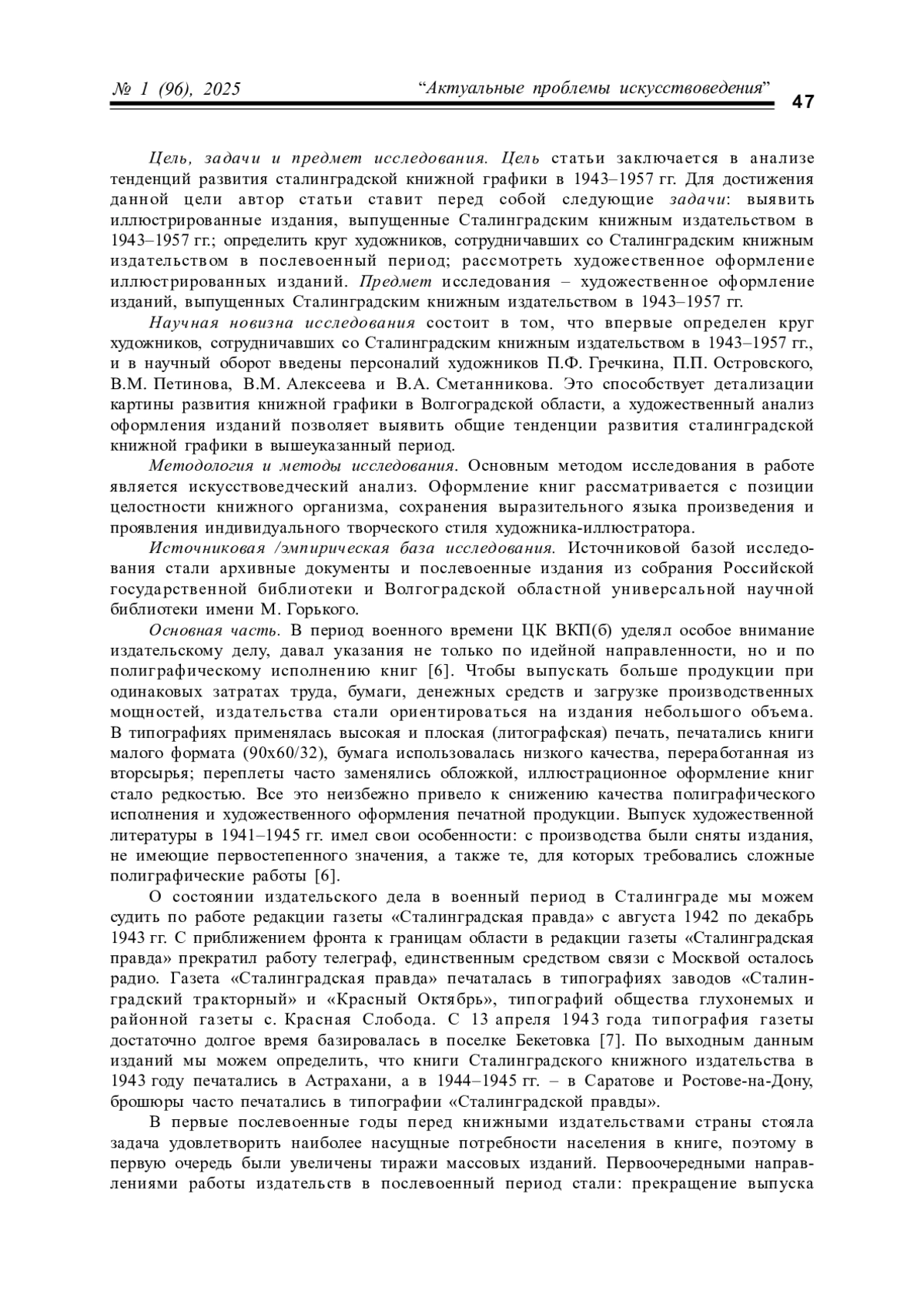 Статья: ТЕНДЕНЦИИ РАЗВИТИЯ СТАЛИНГРАДСКОЙ КНИЖНОЙ ГРАФИКИ В 1943-1957 ГГ (2025)