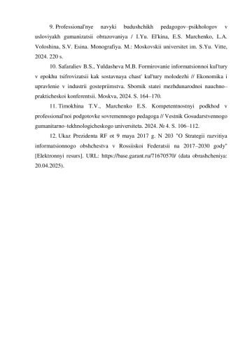 11. Тимохина Т.В., Марченко Е.С. Компетентностный подход в профессиональной подготовке современного педагога // Вестник Государственного гуманитарно-технологического университета. 2024. № 4. С. 106-112. EDN: GYMVUU