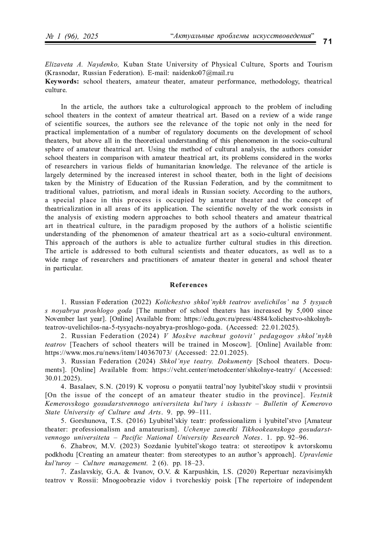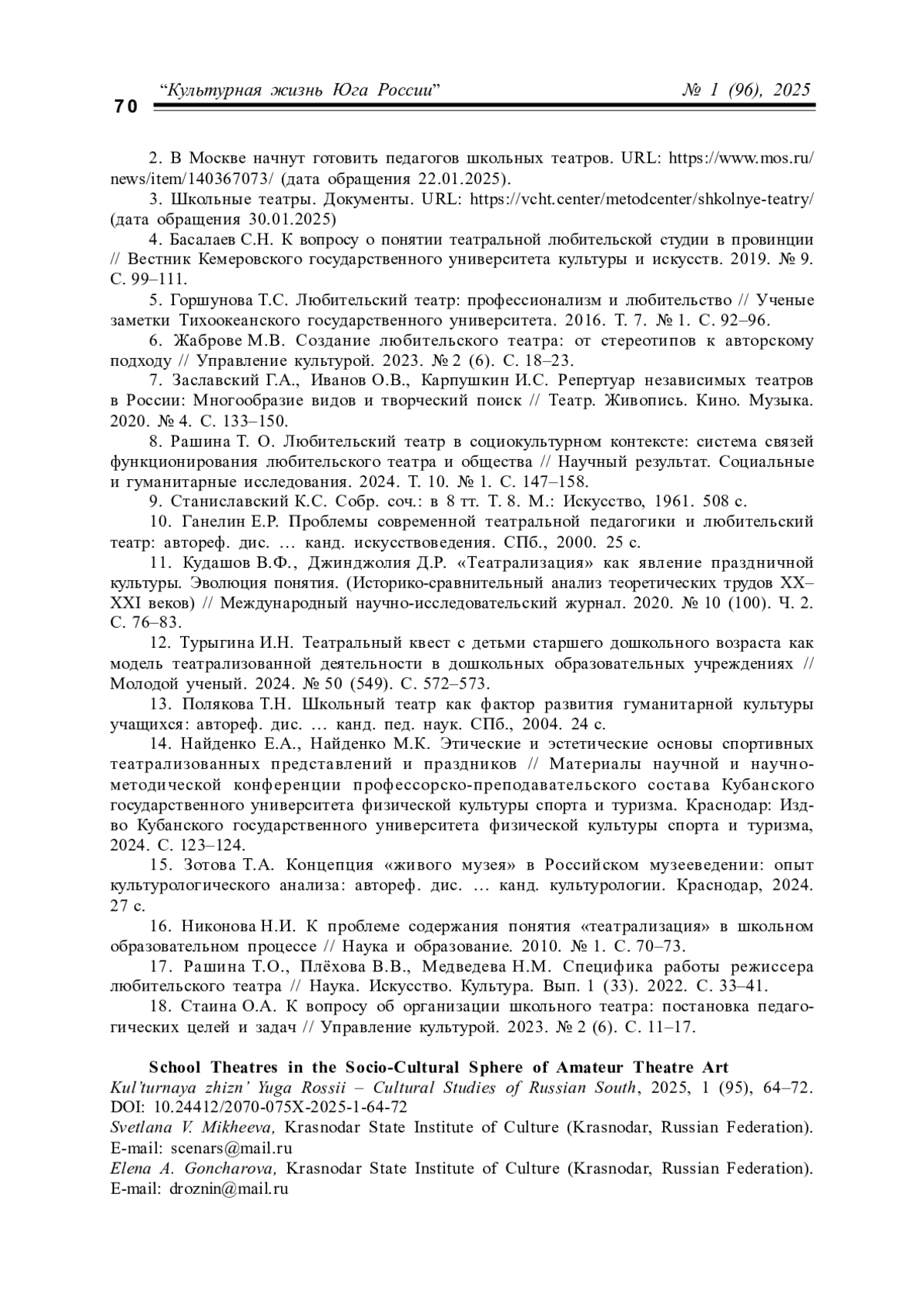 МИХЕЕВА С. В., ГОНЧАРОВА Е. А., НАЙДЕНКО Е. А. ШКОЛЬНЫЕ ТЕАТРЫ В СОЦИОКУЛЬТУРНОЙ СФЕРЕ ЛЮБИТЕЛЬСКОГО ТЕАТРАЛЬНОГО ИСКУССТВА // КУЛЬТУРНАЯ ЖИЗНЬ ЮГА РОССИИ. 2025. № 1 (96)