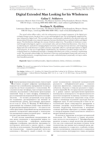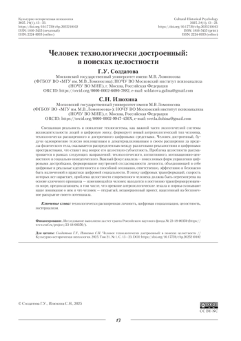 Смешанная реальность и появление техносистемы, как важной части экологической системы жизнедеятельности людей в цифровую эпоху, формирует новый антропологический тип человека, технологически расширенного и достроенного цифровыми средствами. Человек достроенный, будучи одновременно телесно воплощенным и дематериализованным в своем расширении за пределы физического тела, оказывается распределенным между различными реальностями и цифровыми пространствами, что ставит под вопрос его целостную субъектность. Проблема целостности рассматривается в рамках следующих направлений: технологического, когнитивного, мотивационно-ценностного и социально-поведенческого. Важный фокус анализа — поиск новых форм управления цифровыми достройками, формирование внутренней согласованности личности, объединяющей в себе цифровые и реальные идентичности и способной осознанно, ответственно, эффективно и безопасно быть включенной в практики цифровой социальности. В эпоху цифровых трансформаций, скорость которых все нарастает, проблема целостности современного человека должна быть пересмотрена на основе ключевого принципа — изменяющийся человек находится в постоянно трансформирующемся мире, предполагающем, в том числе, что прежние антропологические лекала и нормы сковывают наше понимание о нем и что человек — открытый, незавершенный проект, нацеленный на бесконечное раскрытие своего потенциала.