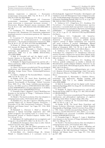 7. Солдатова Г.У., Войскунский А.Е. Социально-когнитивная концепция цифровой социализации: новая экосистема и социальная эволюция психики // Психология. Журнал Высшей школы экономики. 2021. Том 18. № 3. С. 431-450. DOI: 10.17323/1813-8918-2021-3-431-450