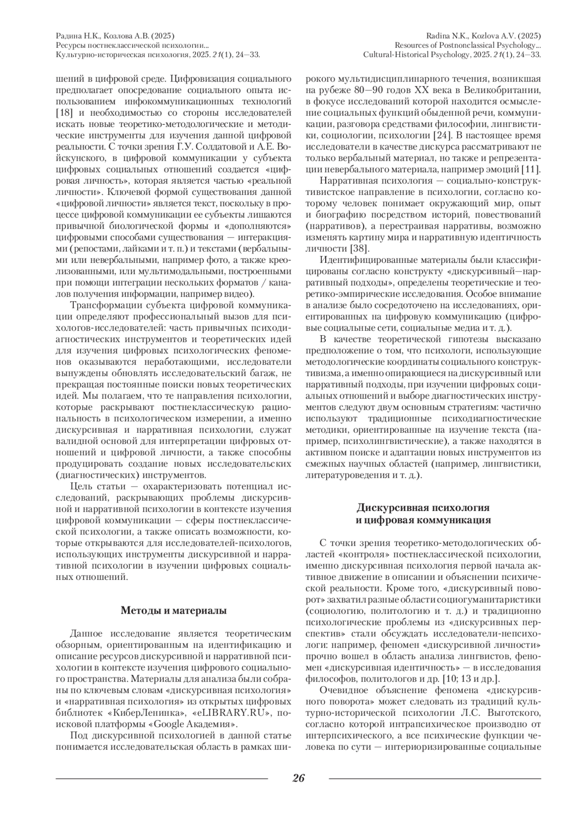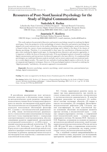 Работа направлена на характеристику потенциала исследований в области дискурсивной и нарративной психологии для изучения цифрового социального пространства. С точки зрения методологии науки дискурсивную и нарративную психологию соотносят с социальным конструктивизмом. В исследованиях российских методологов науки социальный конструктивизм представляют в терминах постнеклассической психологии, связывают с идеями классиков российской психологии; следовательно, в процессе изучения цифрового социального пространства рекомендуется опираться на наследие российских психологов. В процессе выбора дискурсивного или нарративного подходов следует определить фокус потенциального исследования. Если психологический анализ ориентирован на изучение цифровой коммуникации, цифровых интеракций, наиболее ресурсным является дискурсивный подход. Подчеркивается, что для анализа цифровой социальности психологи используют традиционные методики изучения дискурса (интент-анализ, конверсационный анализ и т. д.). Поиск новых методов изучения цифровой эмпирики обусловлен использованием методов компьютерной лингвистики. Если же психологический анализ ориентирован на изучение «цифровой личности», идентичности, рекомендуется использовать нарративный подход.