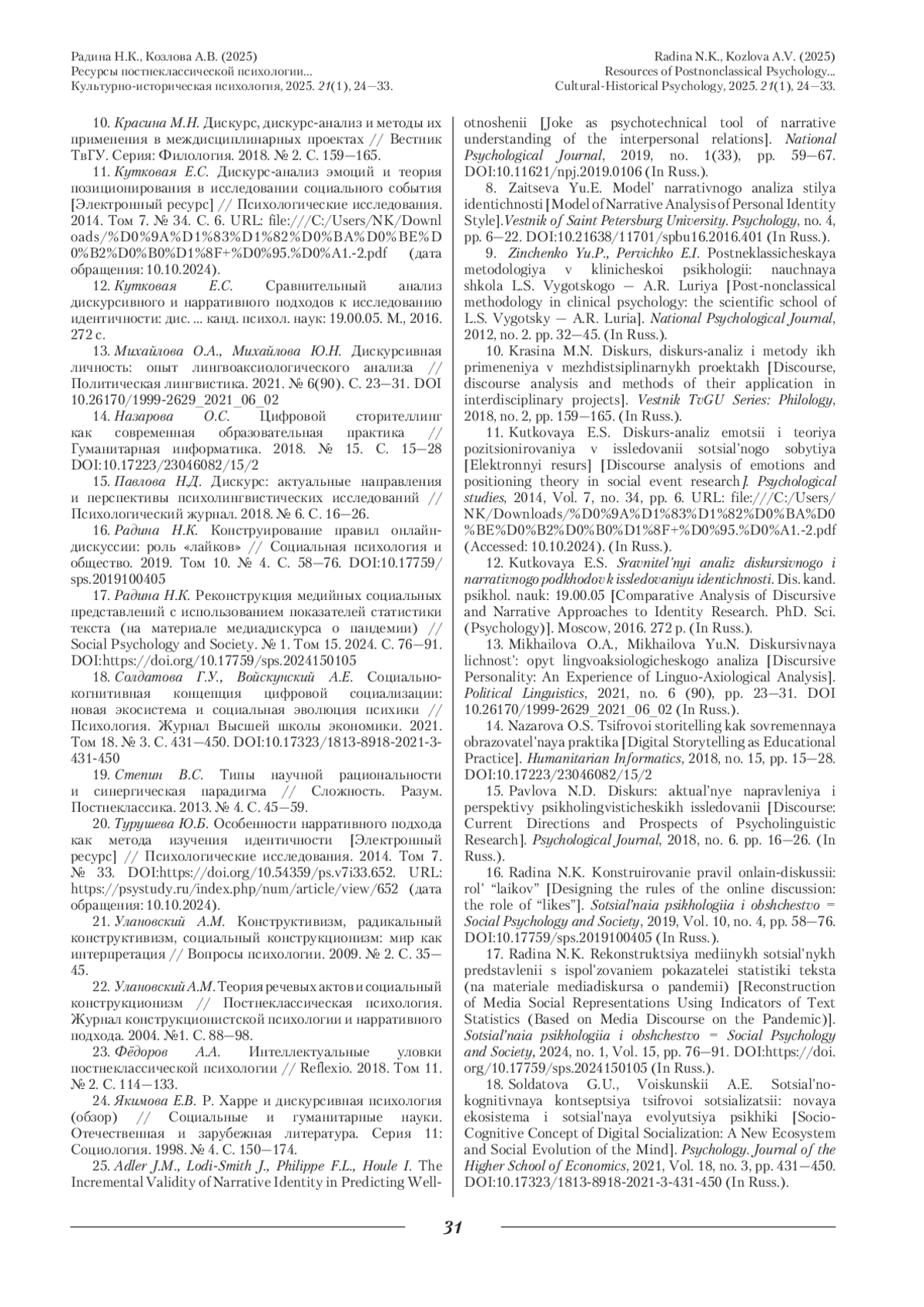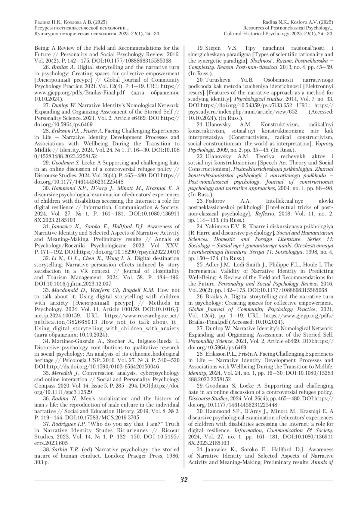 31. Janowicz K., Soroko E., Hallford D.J. Awareness of Narrative Identity and Selected Aspects of Narrative Activity and Meaning-Making. Preliminary results // Annals of Psychology/Roczniki Psychologiczne. 2022. Vol. XXV. P. 171-192. DOI: 10.18290/rpsych2022.0010