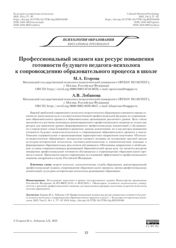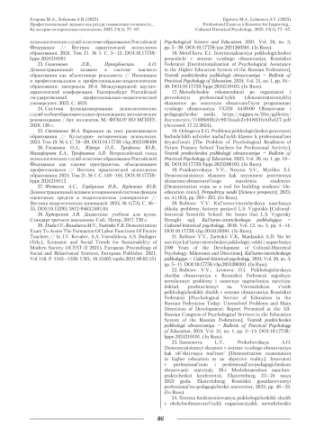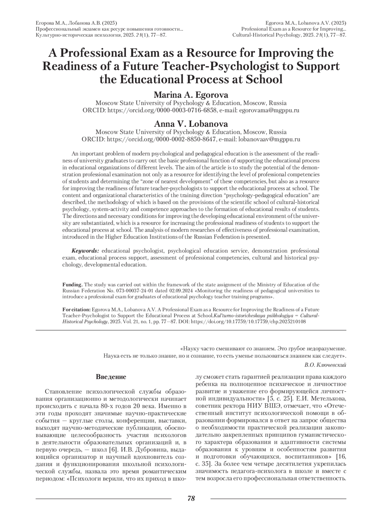 7. Егоренко Т.А., Леонова О.И., Голованова И.А. Демонстрационный экзамен как форма оценки сформированности профессиональных компетенций у будущих педагогов- психологов // Психологическая наука и образование. 2024. Том 29. № 6. С. 54-66. DOI: 10.17759/pse.2024290604