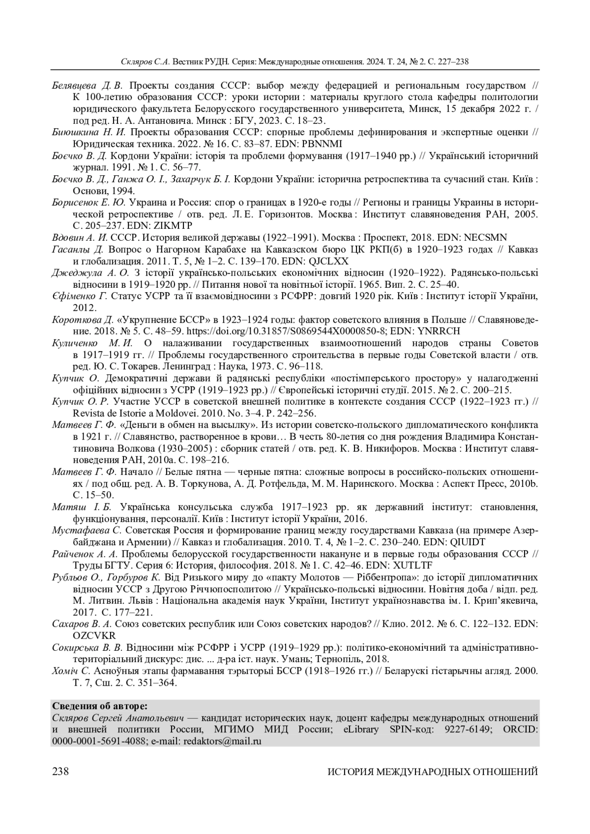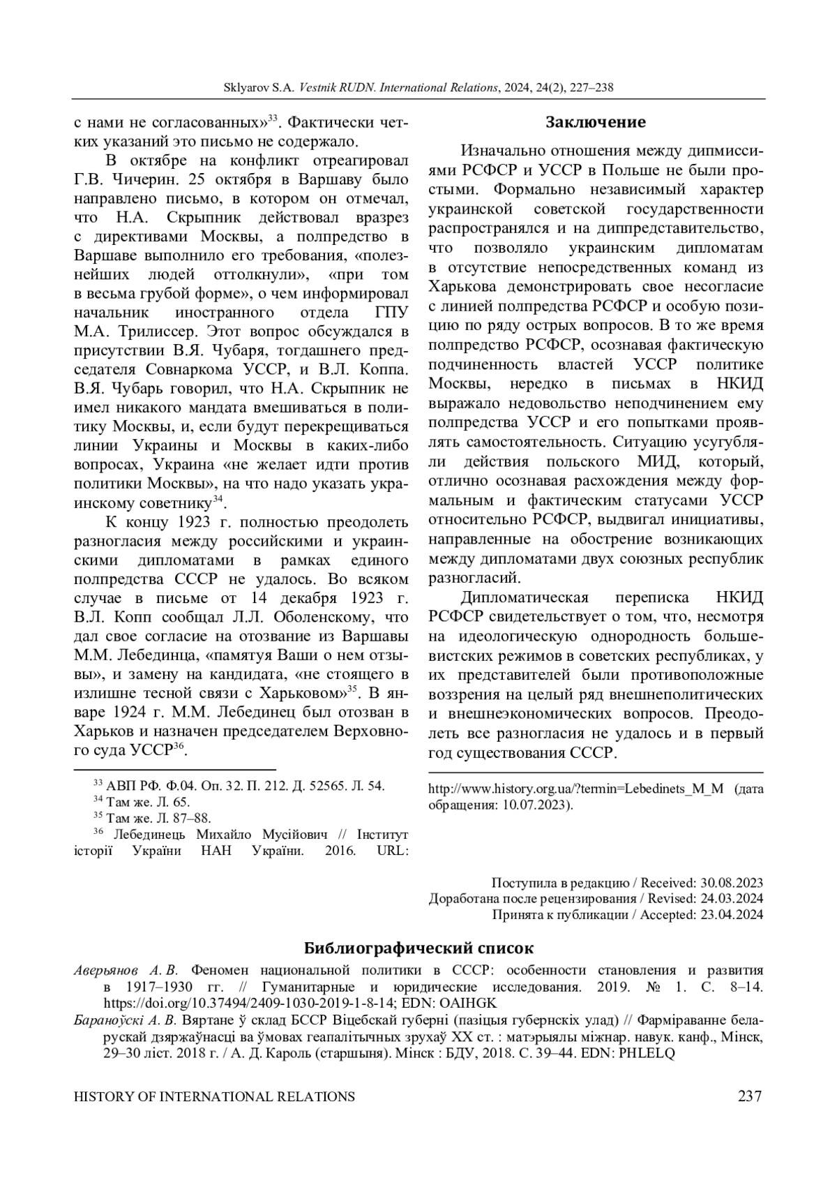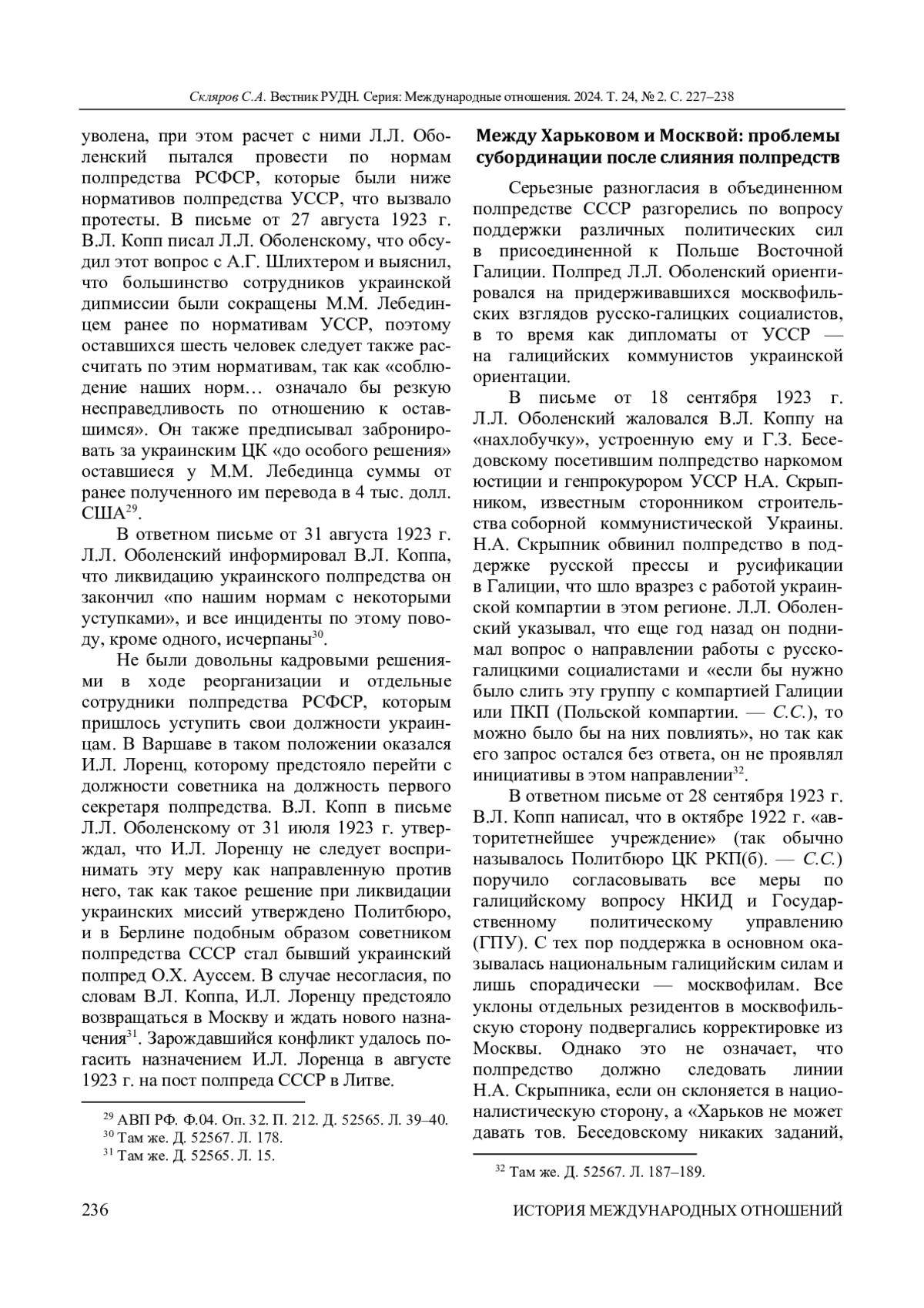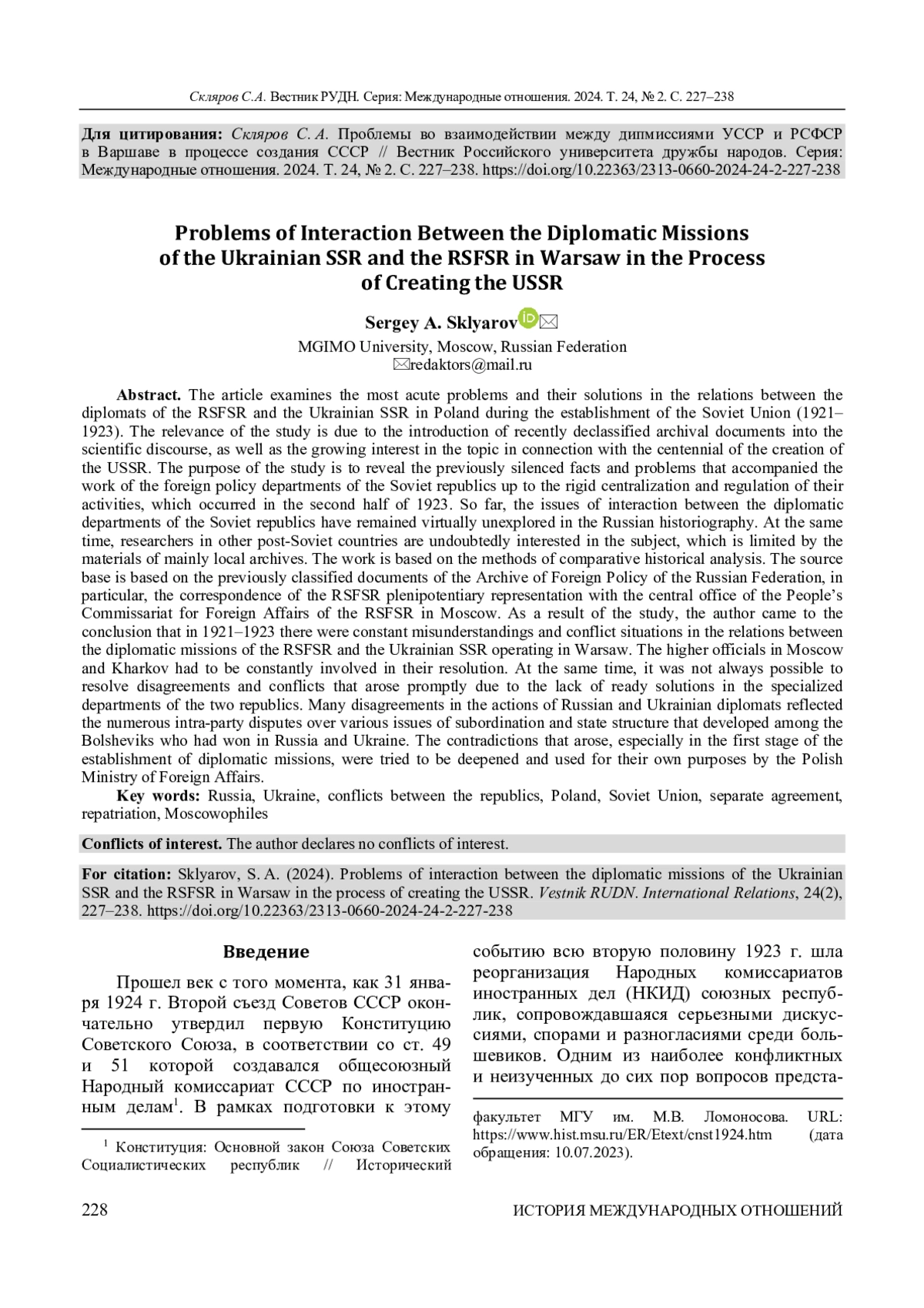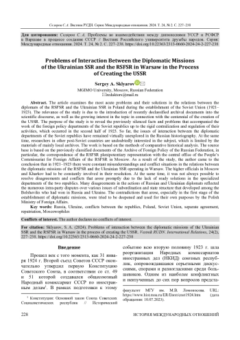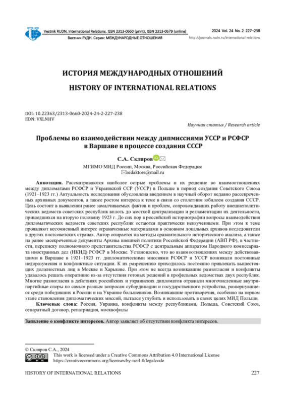 СКЛЯРОВ С. А. ПРОБЛЕМЫ ВО ВЗАИМОДЕЙСТВИИ МЕЖДУ ДИПМИССИЯМИ УССР И РСФСР В ВАРШАВЕ В ПРОЦЕССЕ СОЗДАНИЯ СССР // ВЕСТНИК РОССИЙСКОГО УНИВЕРСИТЕТА ДРУЖБЫ НАРОДОВ. СЕРИЯ: МЕЖДУНАРОДНЫЕ ОТНОШЕНИЯ. 2024. ТОМ 24 № 2