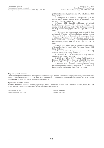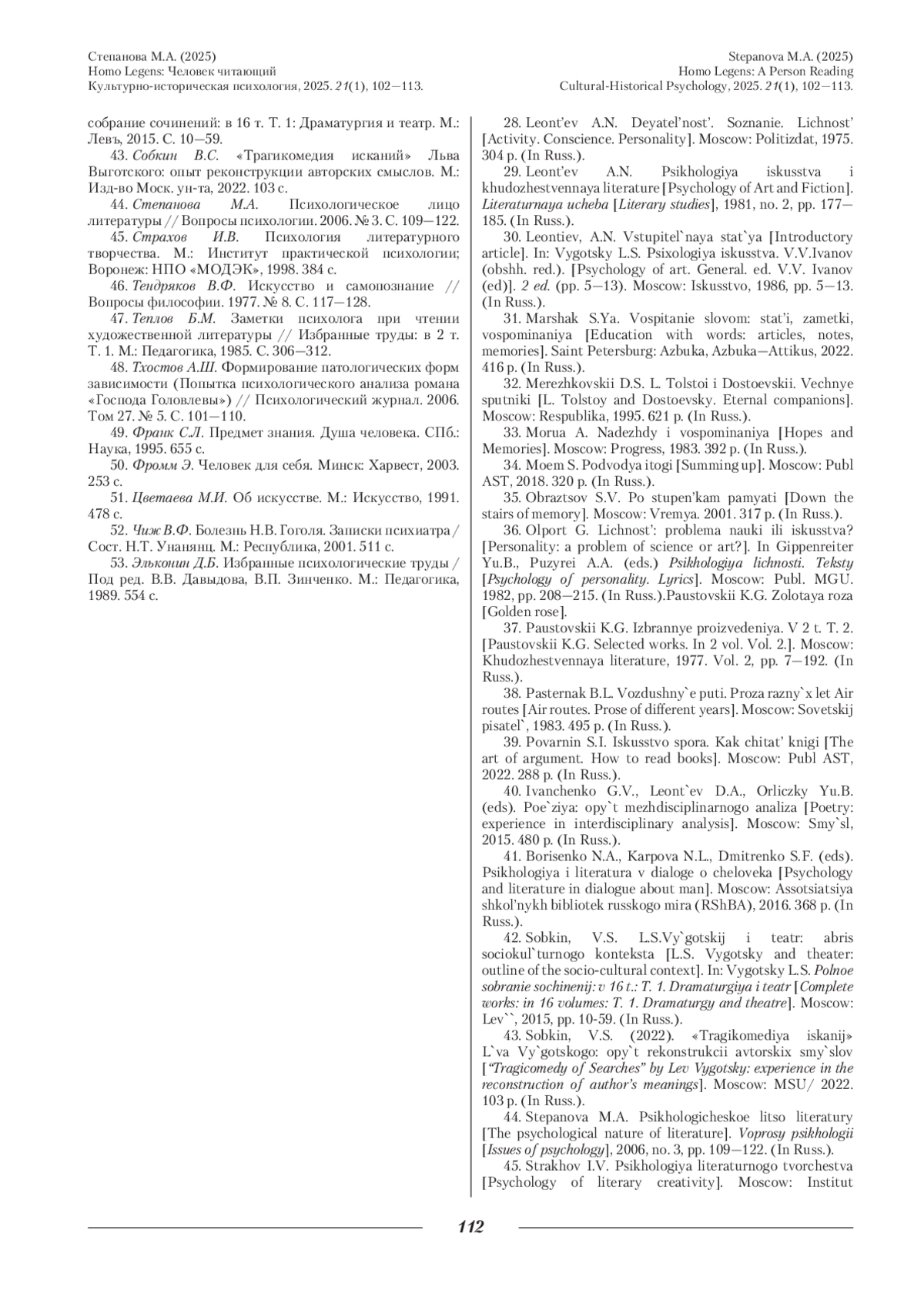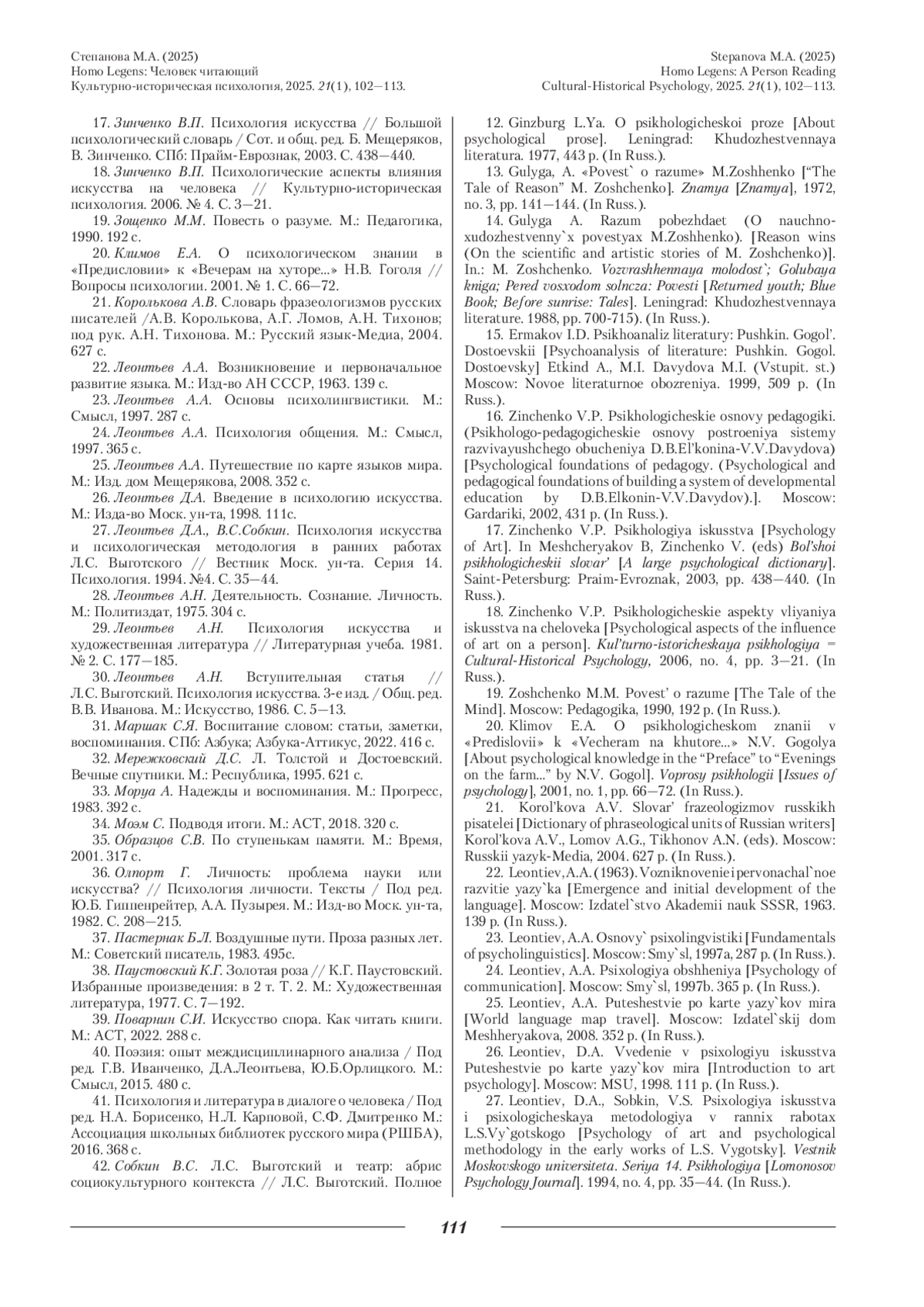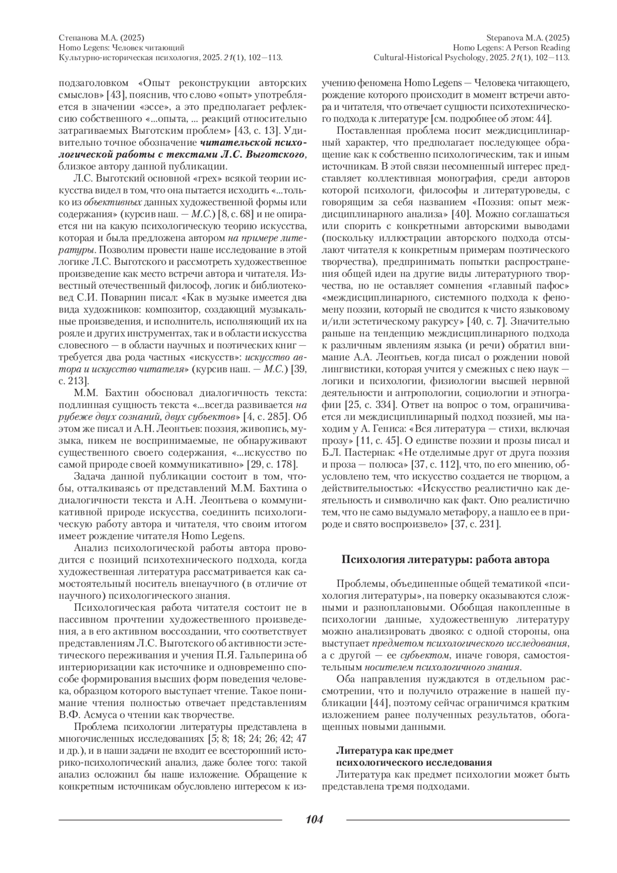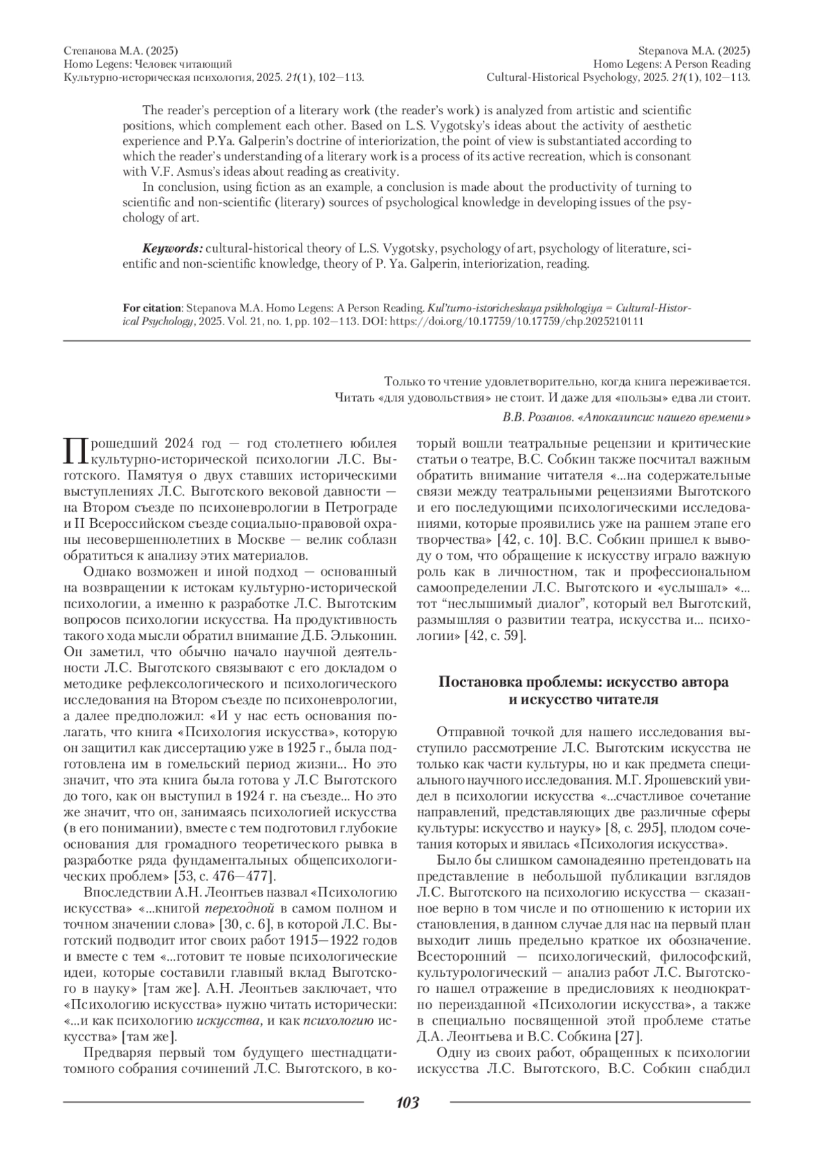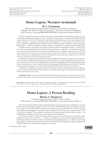 СТЕПАНОВА М. А. HOMO LEGENS: ЧЕЛОВЕК ЧИТАЮЩИЙ // КУЛЬТУРНО-ИСТОРИЧЕСКАЯ ПСИХОЛОГИЯ. 2025. № 1, ТОМ 21