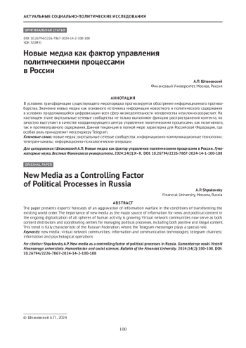 ШПАКОВСКИЙ А. П. НОВЫЕ МЕДИА КАК ФАКТОР УПРАВЛЕНИЯ ПОЛИТИЧЕСКИМИ ПРОЦЕССАМИ В РОССИИ // ГУМАНИТАРНЫЕ НАУКИ. ВЕСТНИК ФИНАНСОВОГО УНИВЕРСИТЕТА. 2024. ТОМ 14, № 2