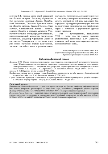 1. Балыхина Т. М. Миссия преподавателя-русиста в международно-ориентированной деятельности университета // Профессионально-педагогические традиции в преподавании русского языка как иностранного. Язык-речь-специальность: материалы Международной научно-практической конференции “Мотинские чтения”. Ч. 1 / под ред. С. А. Хаврониной, Т. М. Балыхиной. Москва: РУДН, 2005. С. 25-38.