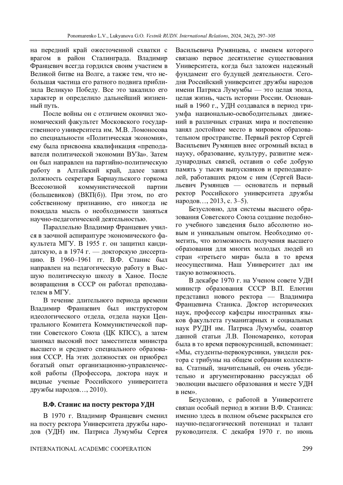 Исследование посвящено деятельности второго ректора Университета дружбы народов (УДН) имени Патриса Лумумбы Владимира Францевича Станиса, харизматичного лидера, пользовавшегося огромным авторитетом среди коллег и внесшего огромный вклад в развитие этого уникального университета. Обозначены основные этапы биографии В. Ф. Станиса, его сложный жизненный путь от участия в Великой Отечественной войне до работы на ответственных государственных постах, в результате чего он приобрел огромный опыт организационно-управленческой работы. Особое внимание авторы уделяют разносторонней деятельности В. Ф. Станиса на посту ректора Университета дружбы народов в течение более 20 лет, с 1970 до 1993 г., подчеркивая, что именно в этот период полностью раскрылся научно-педагогический потенциал Владимира Францевича и его талант руководителя. Подчеркивается, что благодаря умелой работе с кадрами В. Ф. Станису удалось обеспечить формирование в УДН сильных научных и методических школ в рамках различных направлений. При этом особую известность в СССР и за рубежом получили не только научные школы естественных и гуманитарных наук, но и самобытные методики преподавания русского языка как иностранного, иностранных языков, в том числе восточных, разработанные профессорско-преподавательским составом Университета. Вместе с тем ректор активно развивал другие направления деятельности Университета: международные связи, внеаудиторную работу, что требовало глубокого знания истории зарубежных стран и тонкого понимания текущей политической обстановки в них. Авторы показывают, как благодаря огромной самоотдаче и бережному отношению к кадровому и студенческому составу В. Ф. Станису удалось сформировать многотысячный интернациональный коллектив УДН.