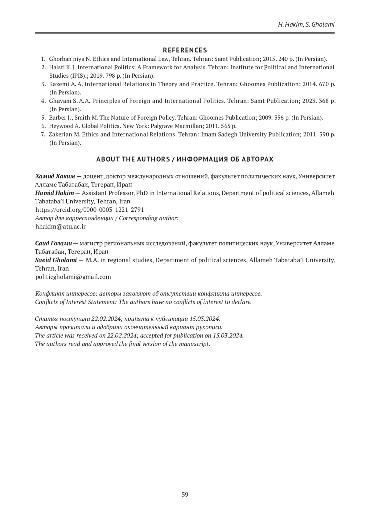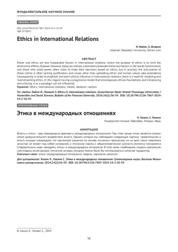 ХАКИМ Х., ГОЛАМИ С. ЭТИКА В МЕЖДУНАРОДНЫХ ОТНОШЕНИЯХ // ГУМАНИТАРНЫЕ НАУКИ. ВЕСТНИК ФИНАНСОВОГО УНИВЕРСИТЕТА. 2024. ТОМ 14, № 2