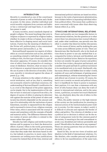 Власть и этика — два неразрывных фактора в международных отношениях. При этом целью этики является ограничение разрушительного воздействия власти. Однако сегодня мы наблюдаем следующую картину: правительства и власть имущие утверждают, что принимают решения на основе этических принципов, но на деле такие заявления зачастую не имеют под собой оснований, а этические нормы и общечеловеческие ценности всячески попираются. Следовательно, надо «внедрять этику» в международные отношения. В этой связи необходимо создать прогрессивную модель, включающую этические основы, которую можно было бы использовать в качестве парадигмы.