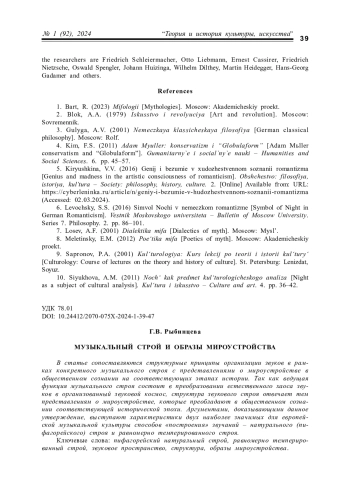 В статье сопоставляются структурные принципы организации звуков в рамках конкретного музыкального строя с представлениями о мироустройстве в общественном сознании на соответствующих этапах истории. Так как ведущая функция музыкального строя состоит в преобразовании естественного хаоса звуков в организованный звуковой космос, структура звукового строя отвечает тем представлениям о мироустройстве, которые преобладают в общественном сознании соответствующей исторической эпохи. Аргументами, доказывающими данное утверждение, выступают характеристики двух наиболее значимых для европейской музыкальной культуры способов «построения» звучаний – натурального (пифагорейского) строя и равномерно темперированного строя