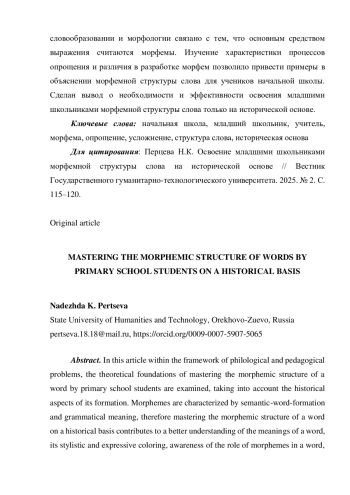 В данной статье в рамках филологической и педагогической проблематики исследуются теоретические основы освоения морфемной структуры слова младшими школьниками с учетом исторических аспектов её формирования. Морфемам свойственно семантико-словообразовательное и грамматическое значение, поэтому освоение морфемной структуры слова на исторической основе способствует лучшему пониманию значений слова, его стилистической и экспрессивной окрашенности, осознанию роли морфем в слове, формированию точности речи. Исторически в рамках развития языка среди структуры большей части слов происходили многочисленные процессы, которые имели связь с изменением общего уровня качества и числа морфем и демонстрируют процесс преобразования общего состава звуков, функций и значений. Анализ фундаментальных теоретических и современных исследований, посвященных изучению морфемной структуры слова и специфике её освоения в начальных классах, показывает необходимость исторически ориентированного построения образовательного процесса. Выявление общих черт и различий в словообразовании и морфологии связано с тем, что основным средством выражения считаются морфемы. Изучение характеристики процессов опрощения и различия в разработке морфем позволило привести примеры в объяснении морфемной структуры слова для учеников начальной школы. Сделан вывод о необходимости и эффективности освоения младшими школьниками морфемной структуры слова только на исторической основе.