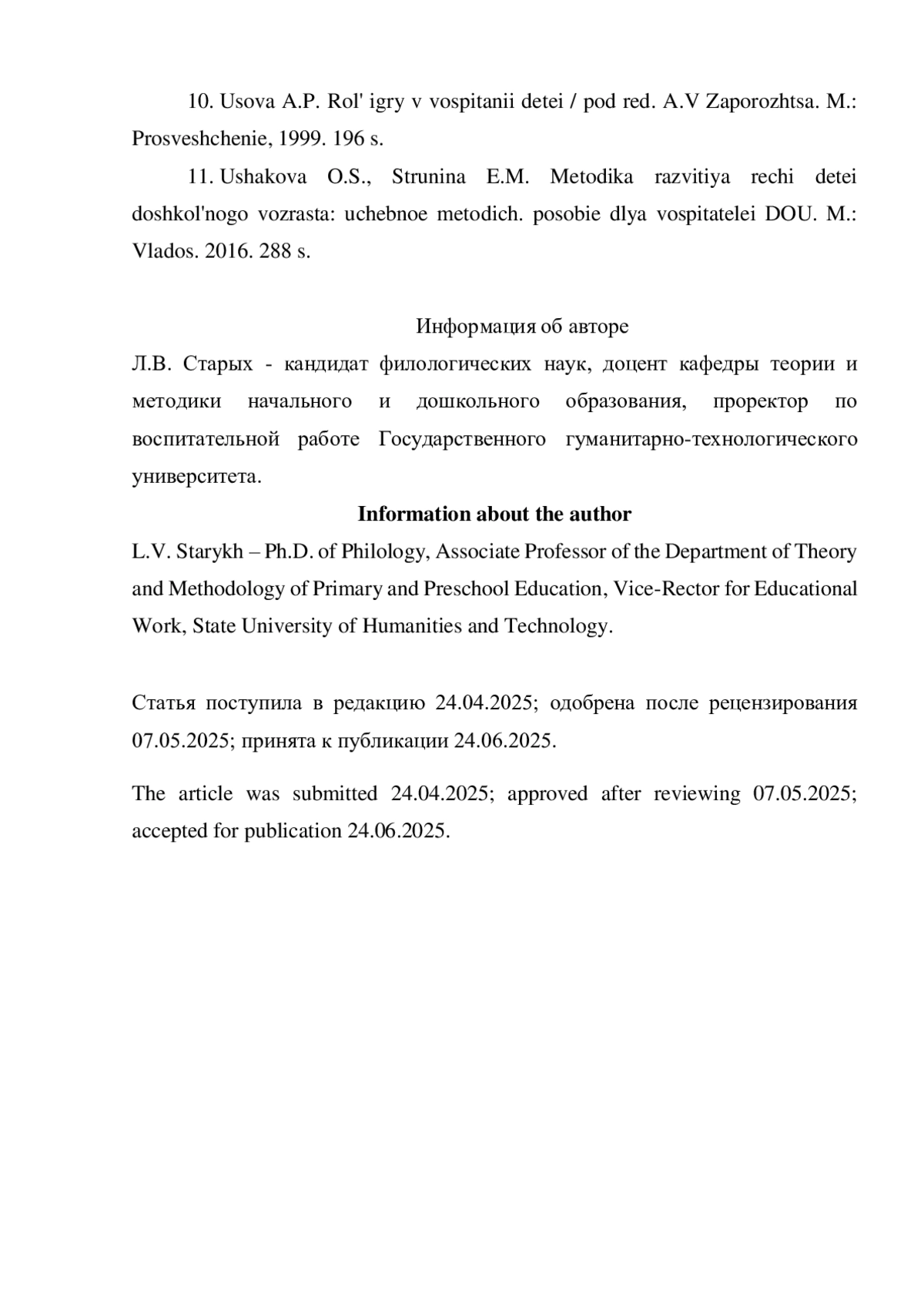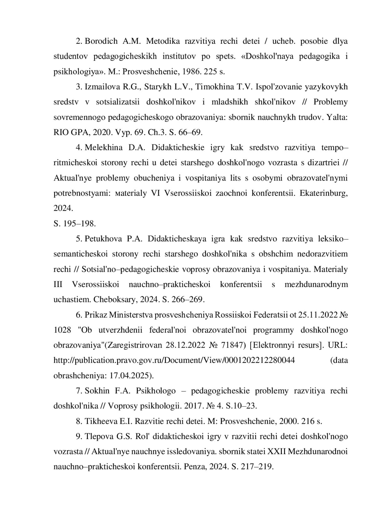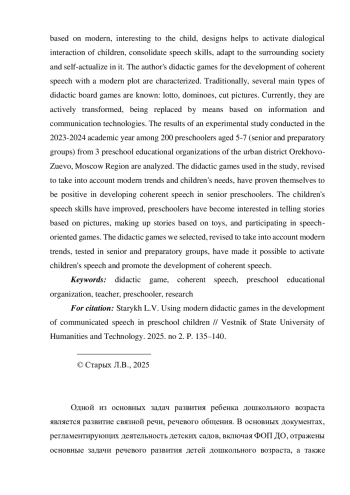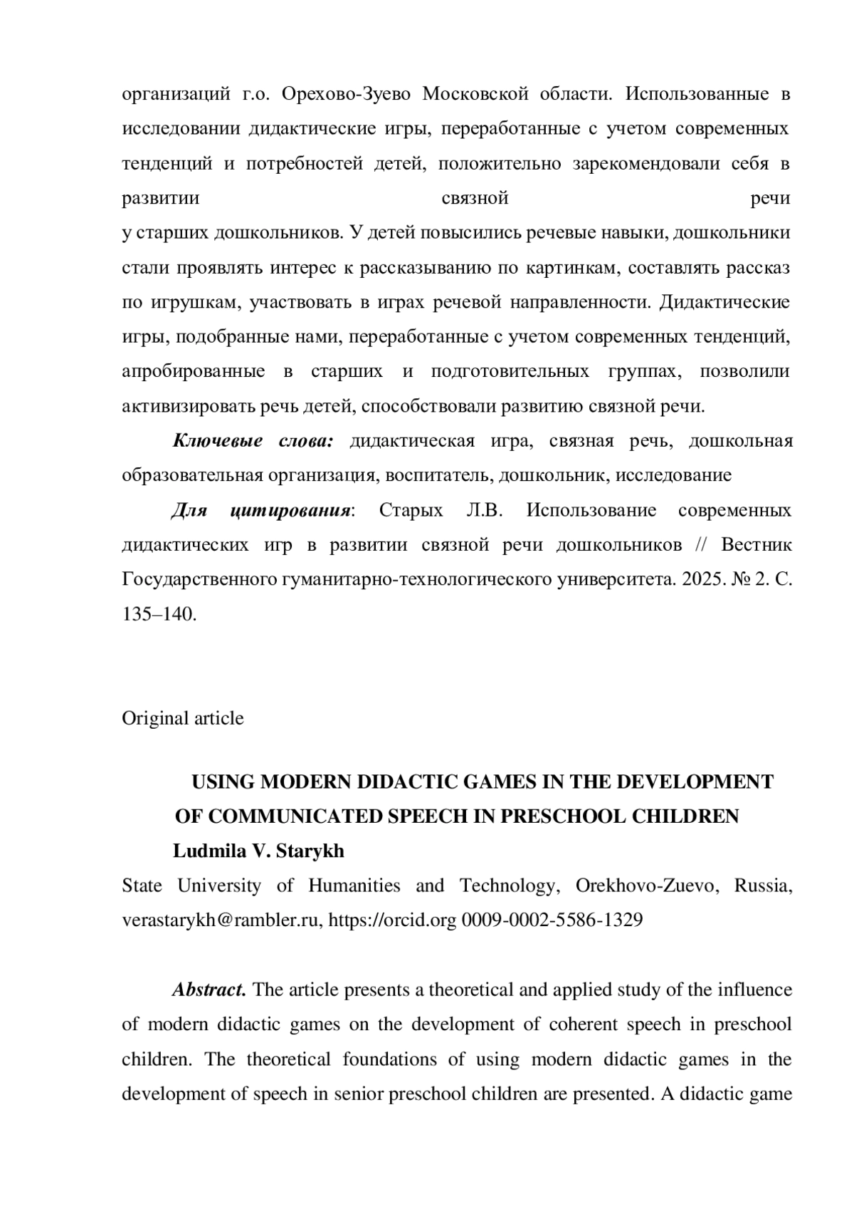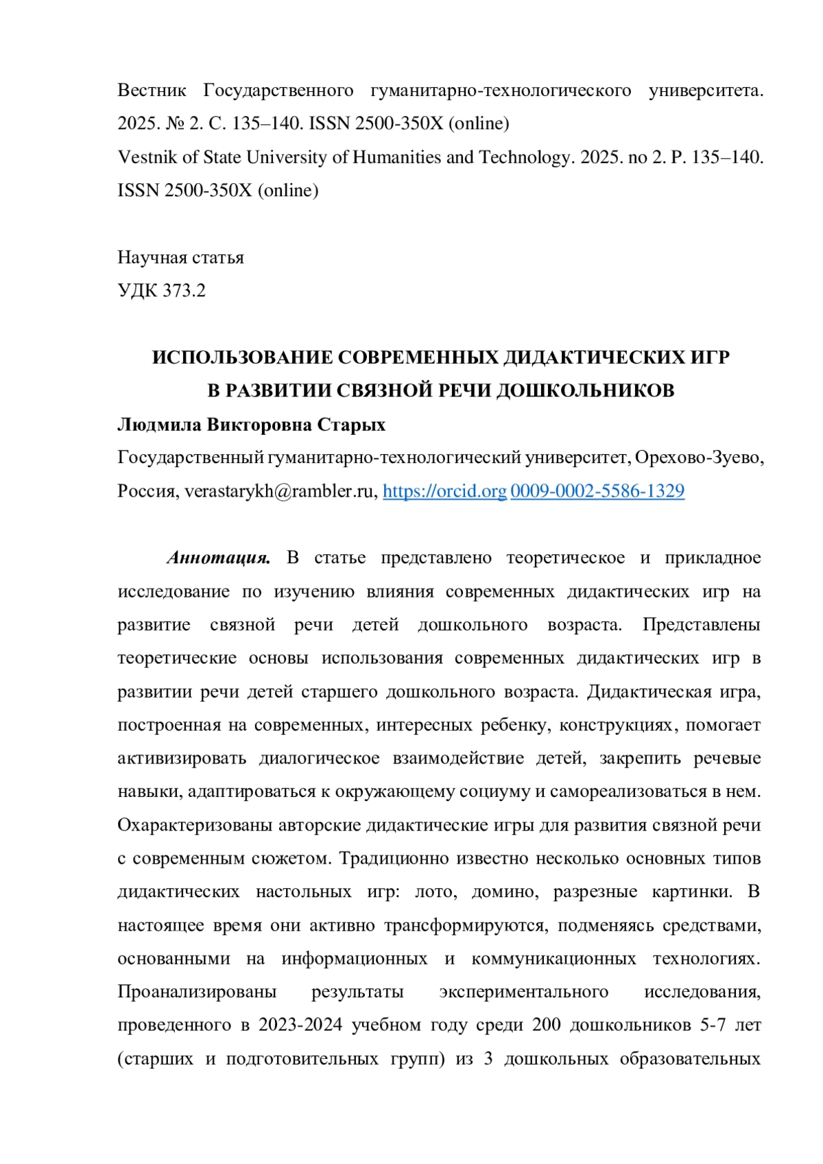 СТАРЫХ Л. В. ИСПОЛЬЗОВАНИЕ СОВРЕМЕННЫХ ДИДАКТИЧЕСКИХ ИГР В РАЗВИТИИ СВЯЗНОЙ РЕЧИ ДОШКОЛЬНИКОВ // ВЕСТНИК ГОСУДАРСТВЕННОГО ГУМАНИТАРНО-ТЕХНОЛОГИЧЕСКОГО УНИВЕРСИТЕТА. 2025. № 2