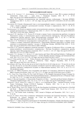 1. Бабаев К. В., Сазонов С. Л., Александрова А. Д. Сотрудничество Китая и стран ЛКА в рамках китайской инициативы “Один пояс - один путь” // Латинская Америка. 2023. № 7. С. 23-39. ;. DOI: 10.31857/S0044748X0026331-3 EDN: QLQYVN