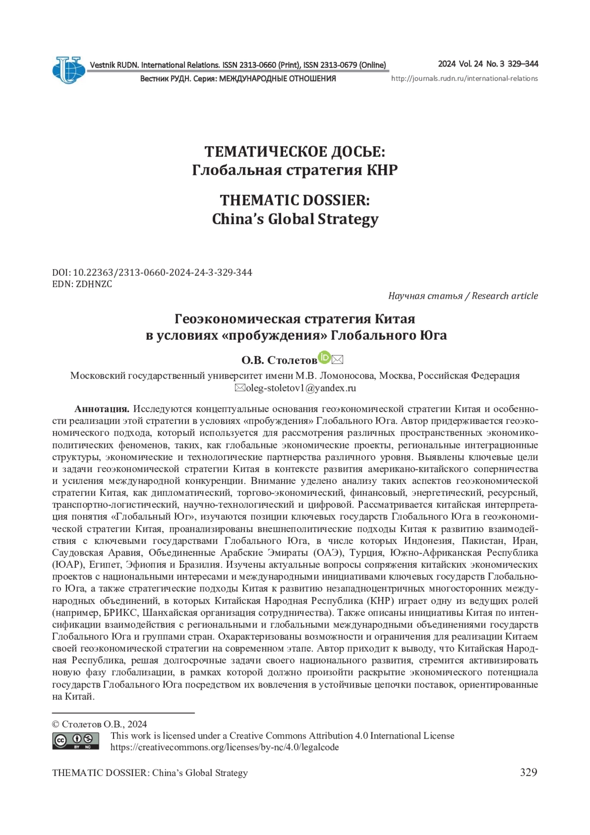 Исследуются концептуальные основания геоэкономической стратегии Китая и особенности реализации этой стратегии в условиях «пробуждения» Глобального Юга. Автор придерживается геоэкономического подхода, который используется для рассмотрения различных пространственных экономико-политических феноменов, таких, как глобальные экономические проекты, региональные интеграционные структуры, экономические и технологические партнерства различного уровня. Выявлены ключевые цели и задачи геоэкономической стратегии Китая в контексте развития американо-китайского соперничества и усиления международной конкуренции. Внимание уделено анализу таких аспектов геоэкономической стратегии Китая, как дипломатический, торгово-экономический, финансовый, энергетический, ресурсный, транспортно-логистический, научно-технологический и цифровой. Рассматривается китайская интерпретация понятия «Глобальный Юг», изучаются позиции ключевых государств Глобального Юга в геоэкономической стратегии Китая, проанализированы внешнеполитические подходы Китая к развитию взаимодействия с ключевыми государствами Глобального Юга, в числе которых Индонезия, Пакистан, Иран, Саудовская Аравия, Объединенные Арабские Эмираты (ОАЭ), Турция, Южно-Африканская Республика (ЮАР), Египет, Эфиопия и Бразилия. Изучены актуальные вопросы сопряжения китайских экономических проектов с национальными интересами и международными инициативами ключевых государств Глобального Юга, а также стратегические подходы Китая к развитию незападноцентричных многосторонних международных объединений, в которых Китайская Народная Республика (КНР) играет одну из ведущих ролей (например, БРИКС, Шанхайская организация сотрудничества). Также описаны инициативы Китая по интенсификации взаимодействия с региональными и глобальными международными объединениями государств Глобального Юга и группами стран. Охарактеризованы возможности и ограничения для реализации Китаем своей геоэкономической стратегии на современном этапе. Автор приходит к выводу, что Китайская Народная Республика, решая долгосрочные задачи своего национального развития, стремится активизировать новую фазу глобализации, в рамках которой должно произойти раскрытие экономического потенциала государств Глобального Юга посредством их вовлечения в устойчивые цепочки поставок, ориентированные на Китай.