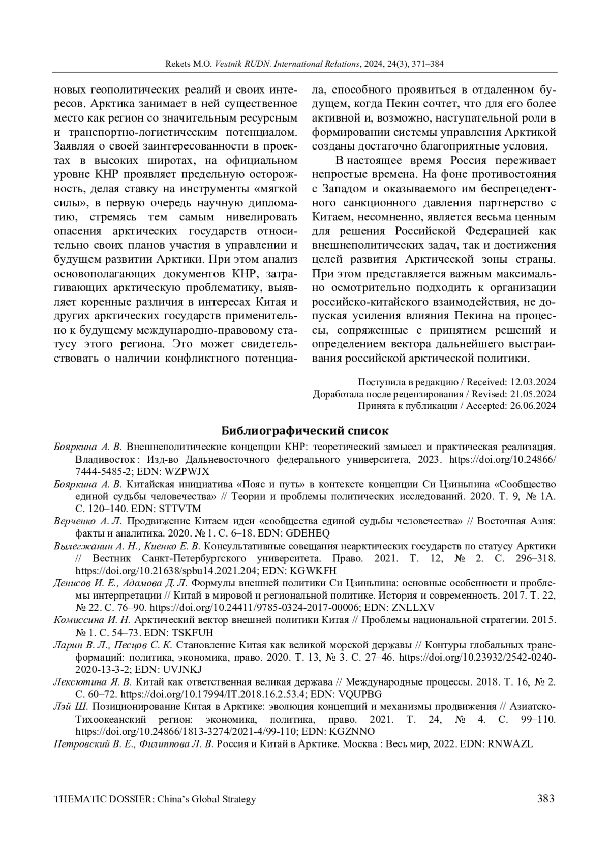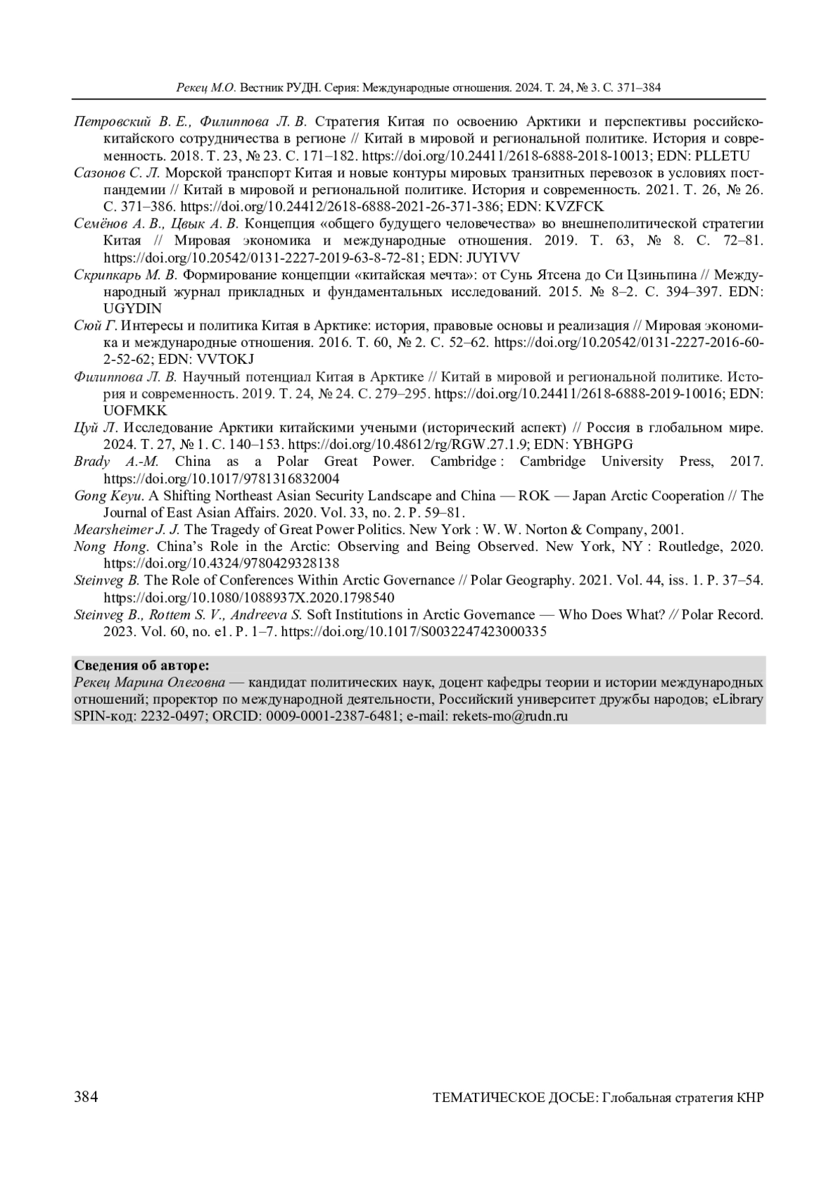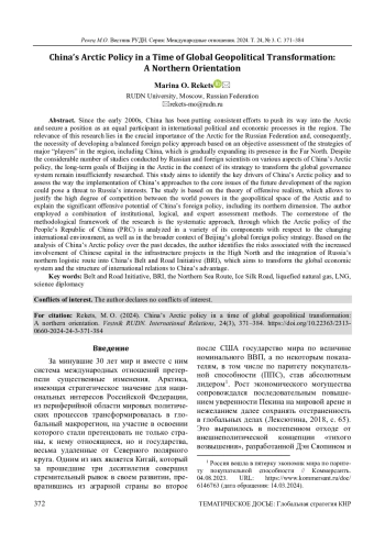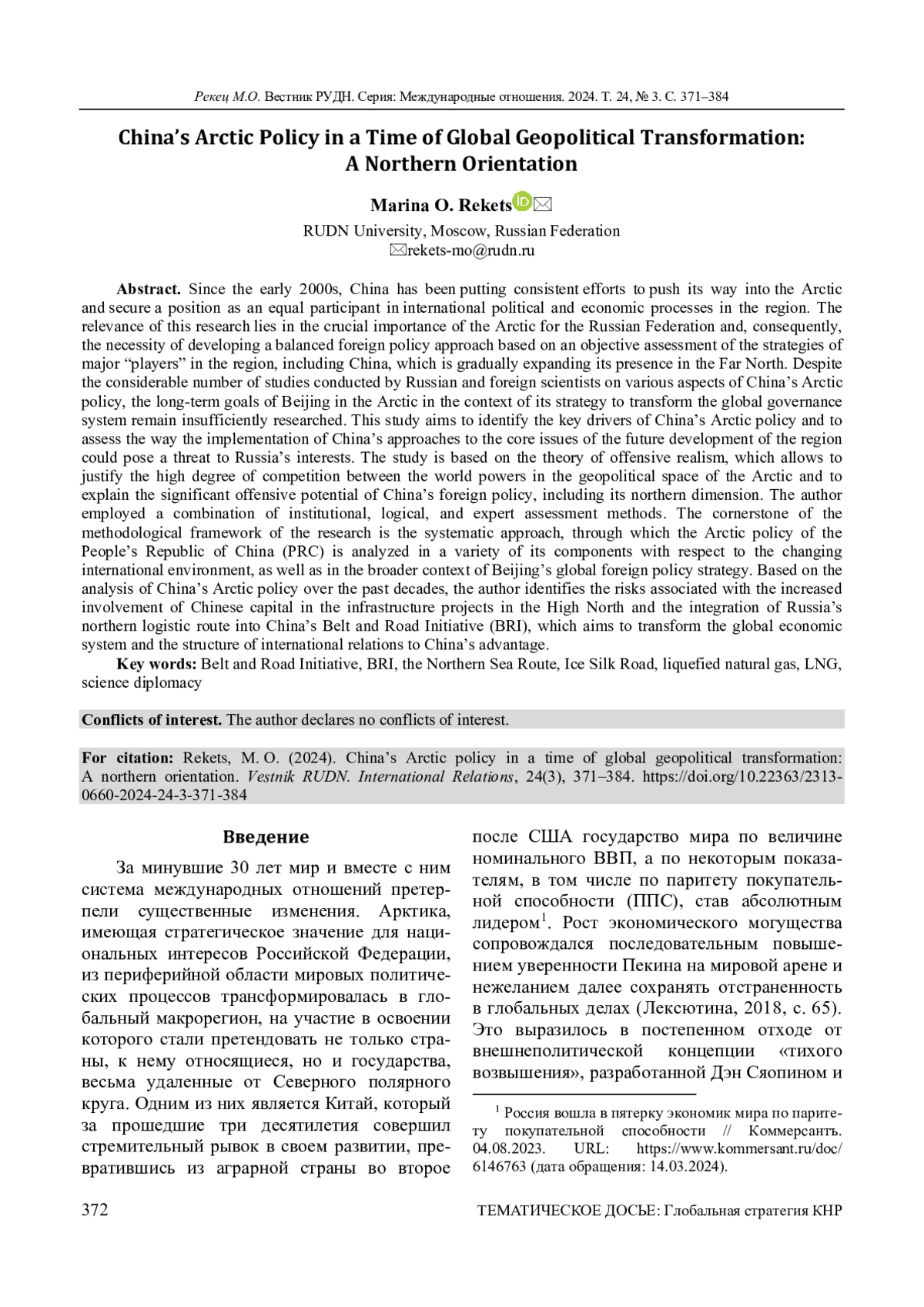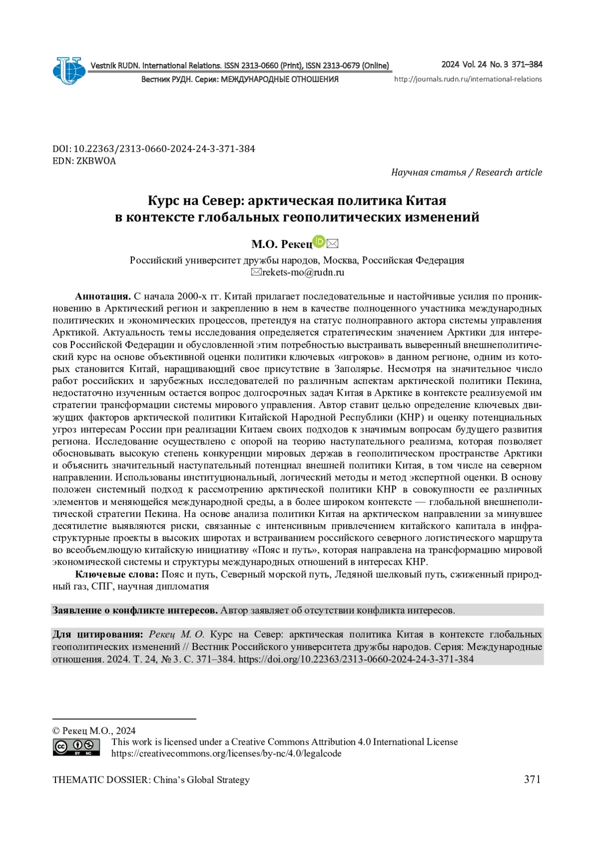 РЕКЕЦ М. О. КУРС НА СЕВЕР: АРКТИЧЕСКАЯ ПОЛИТИКА КИТАЯ В КОНТЕКСТЕ ГЛОБАЛЬНЫХ ГЕОПОЛИТИЧЕСКИХ ИЗМЕНЕНИЙ // ВЕСТНИК РОССИЙСКОГО УНИВЕРСИТЕТА ДРУЖБЫ НАРОДОВ. СЕРИЯ: МЕЖДУНАРОДНЫЕ ОТНОШЕНИЯ. 2024. ТОМ 24 № 3