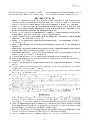 7. Милецкий В. П. Международный терроризм: политико-правовое измерение теории и практики противодействия. Всероссийский криминологический журнал. 2017;11(1):180-189.