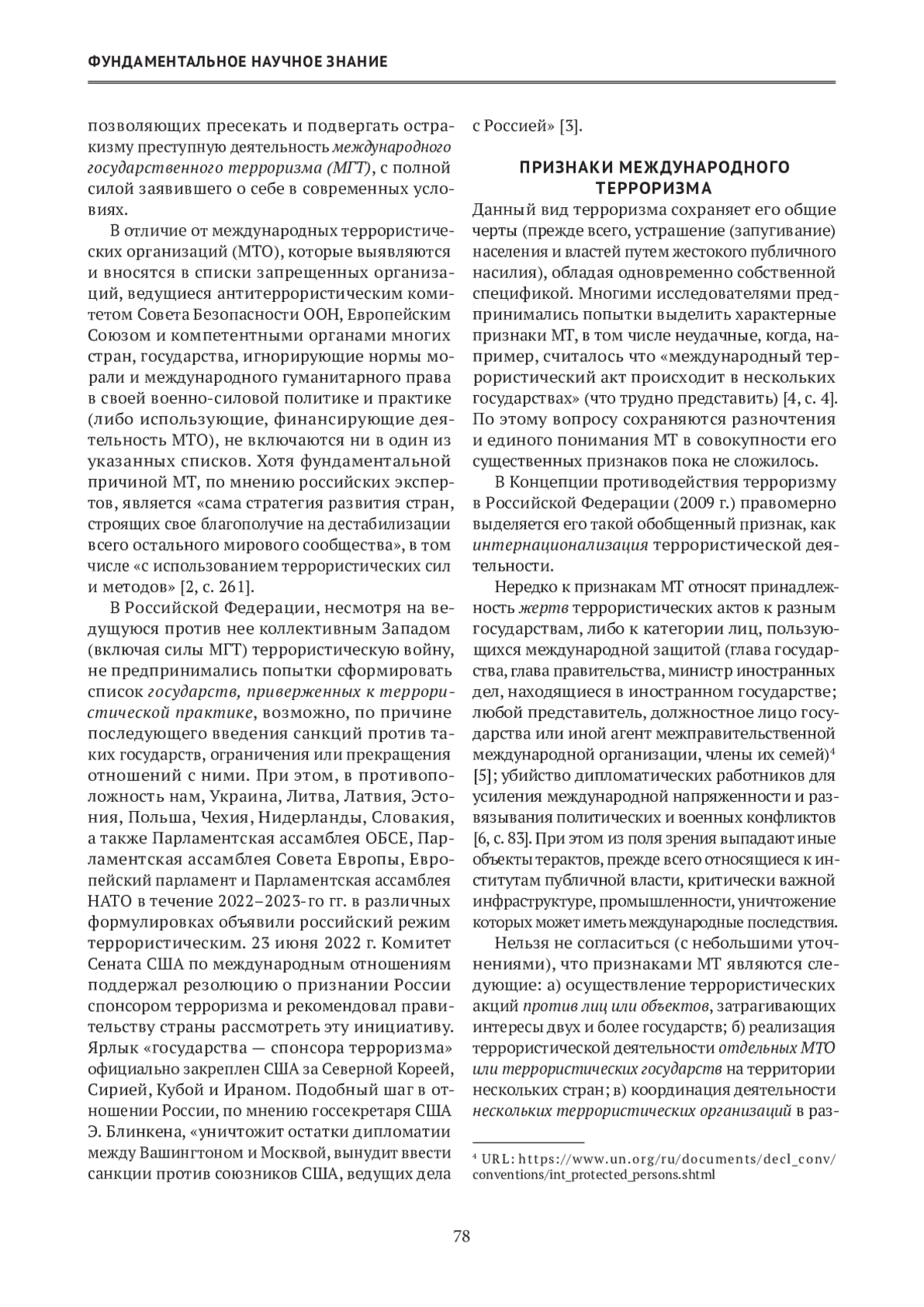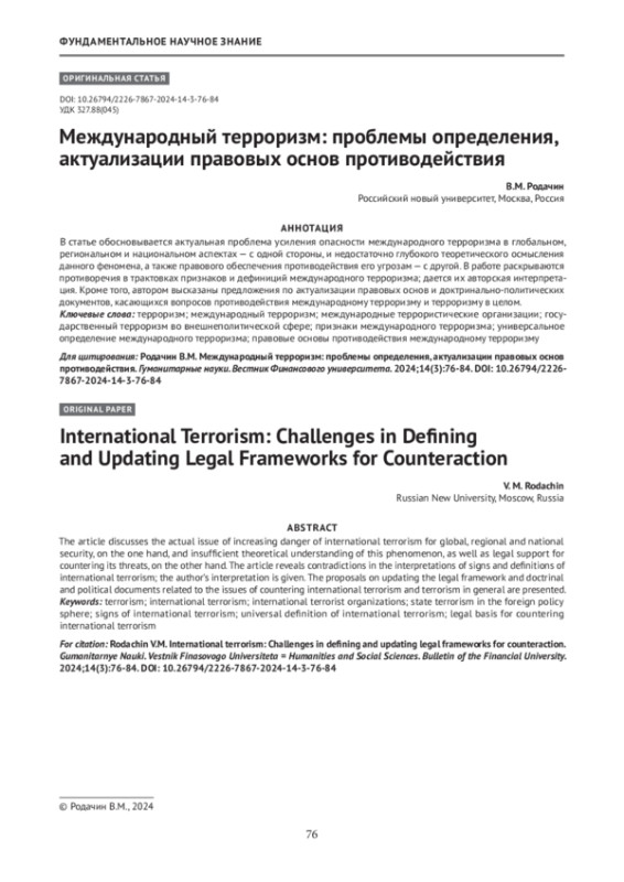 В статье обосновывается актуальная проблема усиления опасности международного терроризма в глобальном, региональном и национальном аспектах — с одной стороны, и недостаточно глубокого теоретического осмысления данного феномена, а также правового обеспечения противодействия его угрозам — с другой. В работе раскрываются противоречия в трактовках признаков и дефиниций международного терроризма; дается их авторская интерпретация. Кроме того, автором высказаны предложения по актуализации правовых основ и доктринально-политических документов, касающихся вопросов противодействия международному терроризму и терроризму в целом.