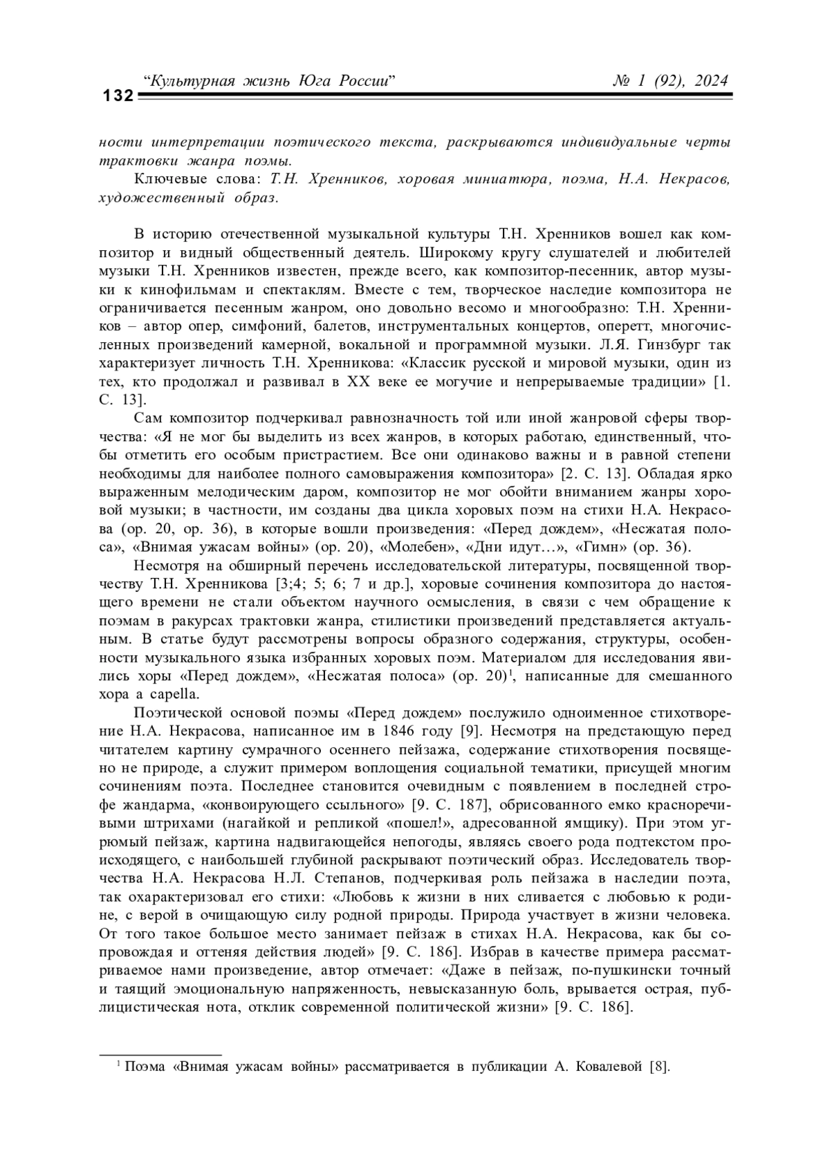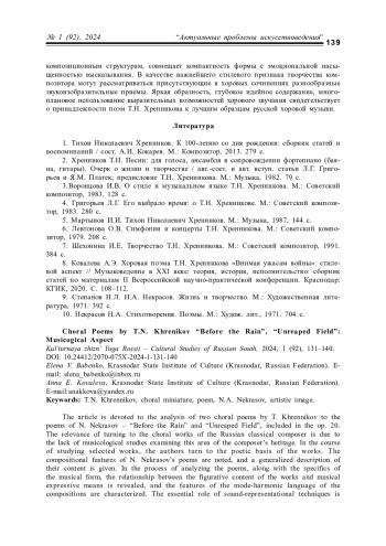 Статья посвящена анализу двух хоровых поэм Т. Н. Хренникова на стихи Н. А. Некрасова – «Перед дождем» и «Несжатая полоса», вошедших в ор. 20. Актуальность обращения к хоровым сочинениям отечественного композитора-классика обусловлена отсутствием музыковедческих исследований, рассматривающих данную область наследия композитора. В процессе анализа поэм, наряду со спецификой музыкальной формы, выявляется взаимосвязь образного содержания произведений с музыкально-выразительными средствами, характеризуются особенности интерпретации поэтического текста, раскрываются индивидуальные черты трактовки жанра поэмы