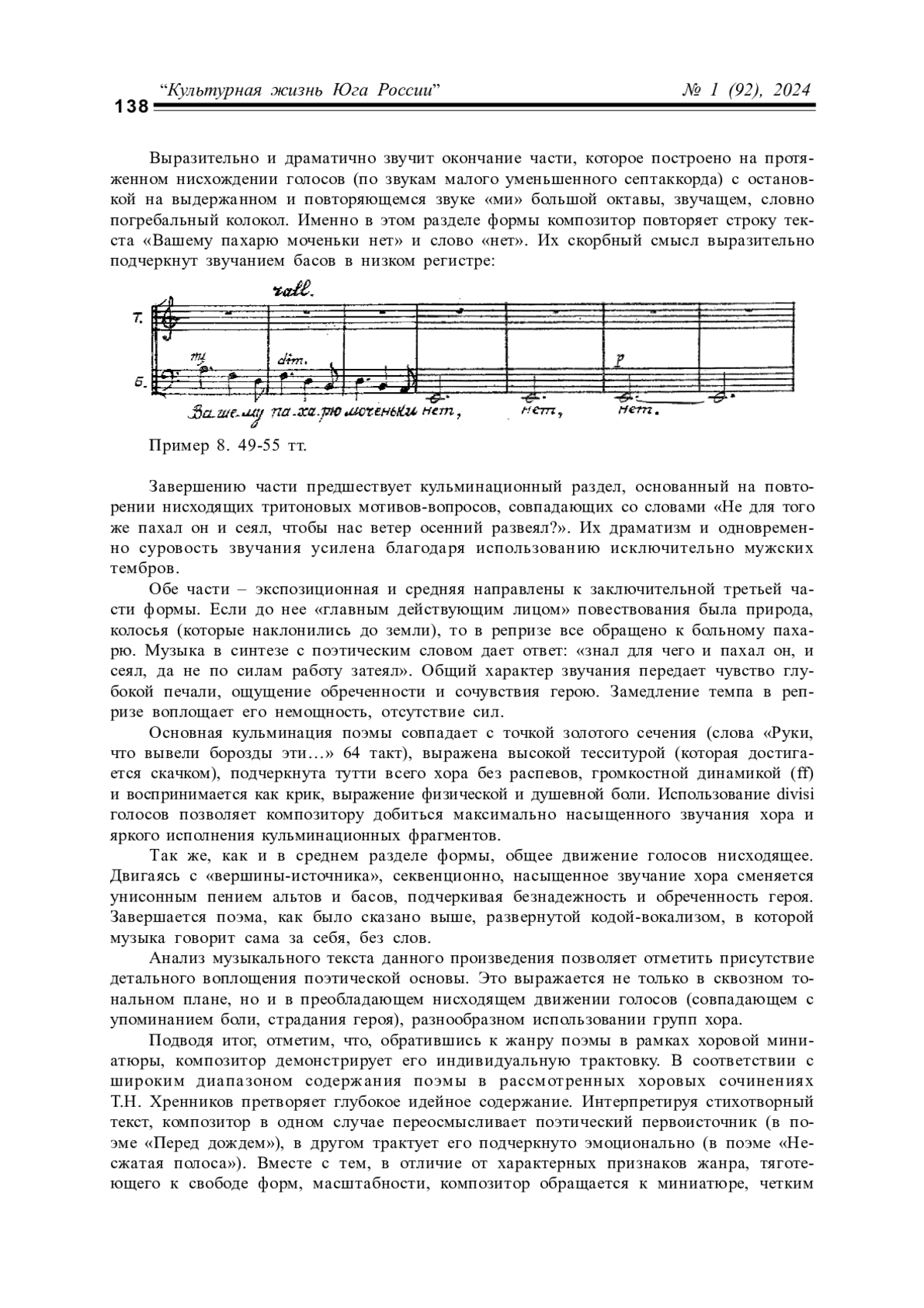 Статья посвящена исследованию отдельных аспектов художественной конц епции первой в истории хоровой музыки Китая оратории «Песня вечного сожаления», созданной композитором Хуан Цзы на стихи поэта Вэй Ханьчжана в 1932 году по поэме «Вечная печаль» классика национальной поэзии Бо-Цзюйи. В ид ейно-философском замысле оратории автор отмечает роль национальнопатриотической идеи, обусловленной событиями китайско-японского конфликта начала 1930-х годов. В музыкальной драматургии оратории отмечены многоплановость, яркие контрасты, наличие драматической, лирической, жанровой сфер; значимость пейзажного начала, картинности. Особо акцентирована оригинальная трактовка синтеза музыки и поэтического слова, преломляющая особенности национальных культурных традиций