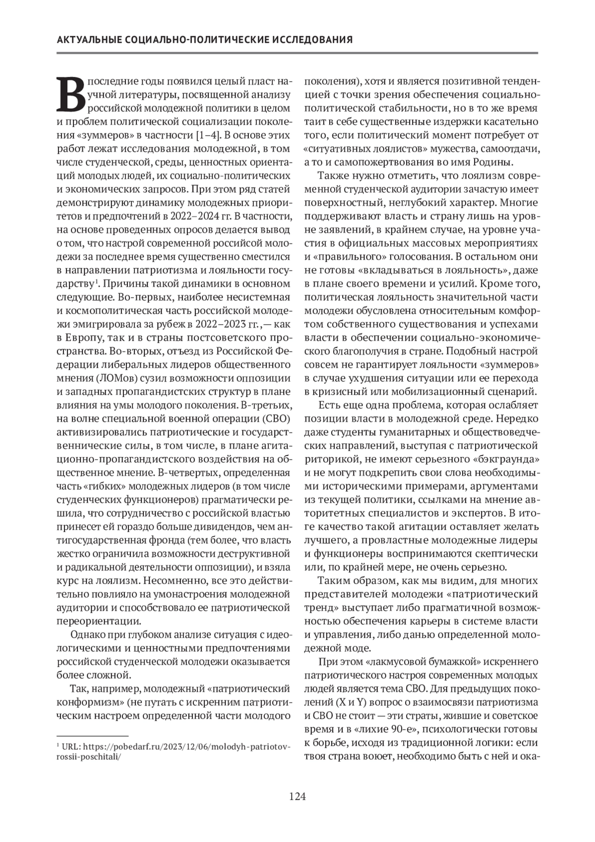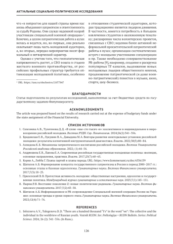 1. Селезнева А. В., Тулегенова Д. Д. «В слове «мы» сто тысяч «я»: коллективное и индивидуальное в мировоззрении российской молодежи. Вестник РУДН. Сер. Политология. 2024;26(2):341-356.