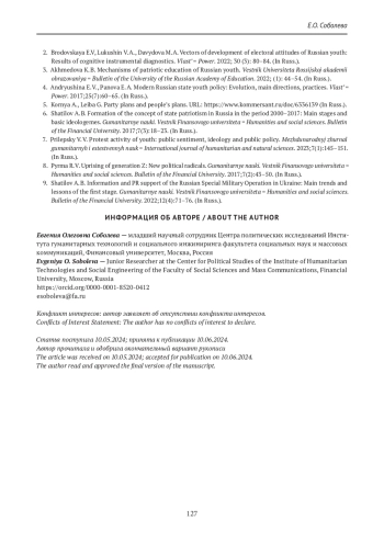2. Бродовская Е. В., Лукушин В. А., Давыдова М. А. Векторы развития электоральных установок российской молодежи: результаты когнитивной инструментальной диагностики. Власть. 2022;30(3):80-84.