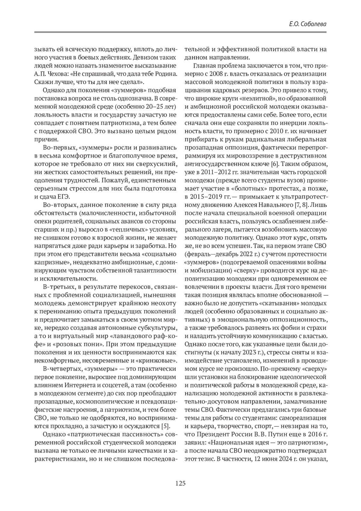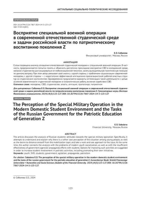 Статья посвящена анализу отношения отечественной студенческой молодежи к специальной военной операции. В частности, предпринимается попытка понять и объяснить достаточно прохладное восприятие СВО в молодежной среде, желание студенчества дистанцироваться от мобилизационной тематики, занять выжидательную политическую позицию по данному вопросу. При этом автор увязывает свой анализ, с одной стороны, с проблемами социализации современной молодежи, с другой стороны — с недостаточно эффективной агитационно-пропагандистской работой властных структур со студенческим контингентом. Одновременно предлагаются варианты оптимизации такой деятельности с целью усиления вовлеченности студенческой молодежи в патриотическую работу, включая содействие СВО.