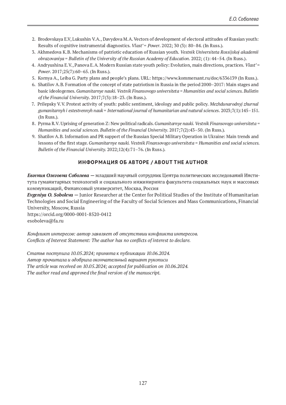 7. Прилепский В. В. Протестная активность молодежи: общественные настроения, идеология и государственная политика. Международный журнал гуманитарных и естественных наук. 2023;7(1):145-151.
