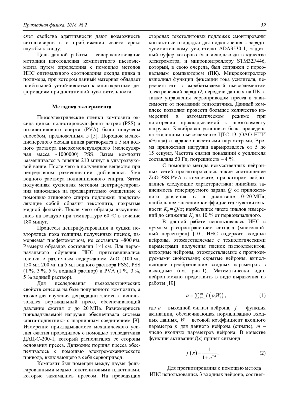 Статья: Исследование и прогнозирование деградации свойств пьезочувствительных элементов на базе композита оксида цинка и полимерных электролитов (2018)