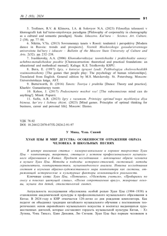 Статья: ХУАН ЦЗЫ И МИР ДЕТСТВА: ОСОБЕННОСТИ ОТРАЖЕНИЯ ОБРАЗА ЧЕЛОВЕКА В ШКОЛЬНЫХ ПЕСНЯХ (2024)