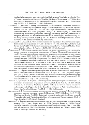15. Мартьянова К. А. Технологии осуществления аудиовизуального перевода // Проблемы языка и перевода в трудах молодых ученых. Н. Новгород: НГЛУ, 2022. Вып. 21. С. 97-100.