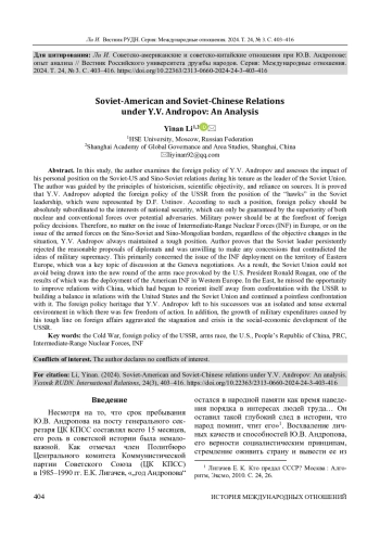 Рассматривается политика Ю. В. Андропова и его личная позиция в ключевых вопросах отношений СССР с США и КНР в годы руководства Советским Союзом. На этой основе оценены влияние и последствия действий Ю. В. Андропова на внешнеполитическое развитие СССР. Автор руководствовался принципами историзма, научной объективности и опоры на источники. Доказано, что Ю. В. Андропов формировал внешнюю политику страны с позиции «ястребов» в советском руководстве, представленных Д. Ф. Устиновым. Согласно этой позиции, внешняя политика абсолютно подчинена интересам национальной безопасности, предполагающей превосходство ядерных и обычных сил над силами потенциальных противников, а военная сила должна выходить на первый план при принятии внешнеполитических решений. Поэтому как по проблеме ракет средней дальности (РСД) в Европе, так и по вопросу о размещении вооруженных сил на советско-китайской и китайско-монгольской границах Ю. В. Андропов, игнорируя объективные изменения обстановки, неизменно придерживался жесткой позиции. Автор приводит свидетельства того, как советский руководитель неоднократно отвергал разумные предложения дипломатов и не желал идти на какие-либо уступки, которые противоречили идеям военного превосходства. В первую очередь это касалось вопроса размещения РСД на территории Восточной Европы, который обсуждался на переговорах в Женеве. В итоге Советскому Союзу не удалось избежать вовлечения в новый виток гонки вооружений, спровоцированный президентом США Р. Рейганом, вследствие чего американские РСД были размещены в Западной Европе. На Востоке Ю. В. Андропов упустил возможность улучшить отношения с Китаем, который начал переориентироваться от конфронтации с СССР на выстраивание баланса в отношениях с США и Советским Союзом, и продолжил бессмысленную конфронтацию с ним. Внешнеполитическое наследие Ю. В. Андропова - изолированная, напряженная внешняя обстановка, не подразумевающая свободы действий. Кроме того, увеличение военных расходов, вызванное его жесткой внешнеполитической линией, усугубило «застой» и кризис социально-экономического развития СССР.