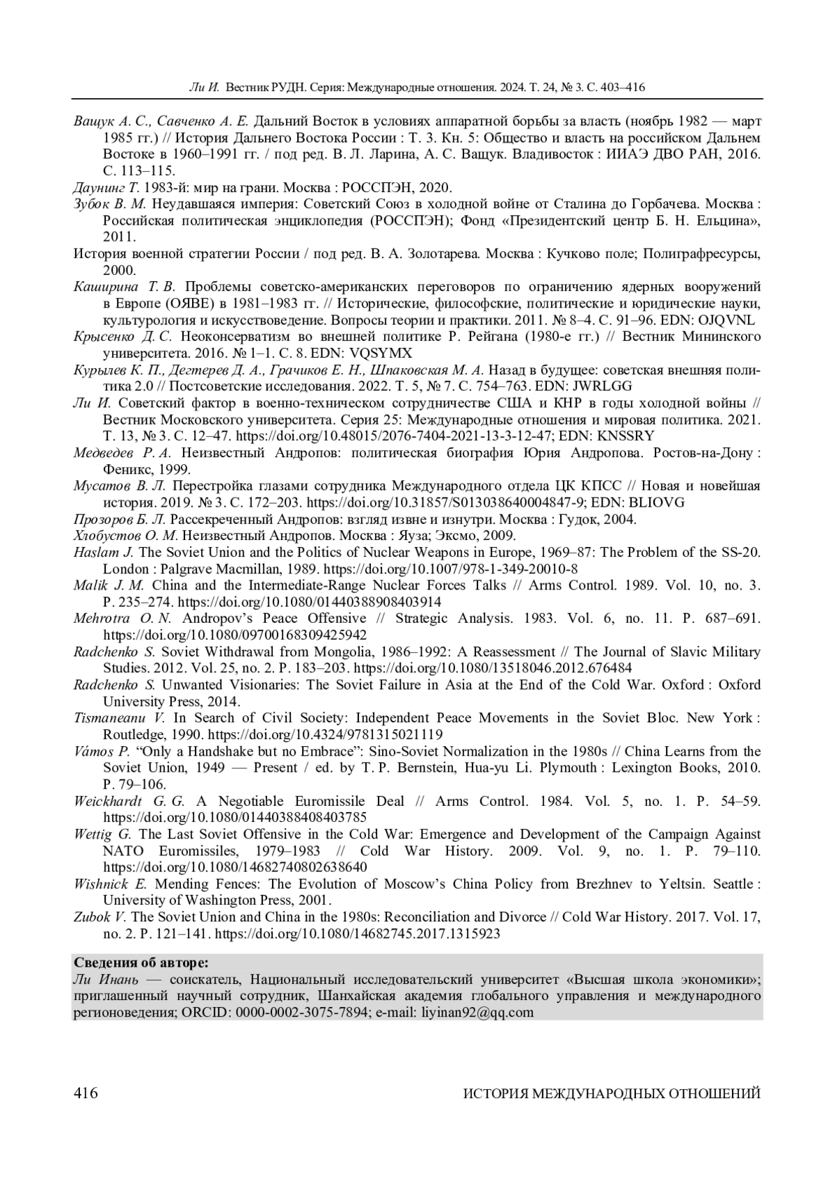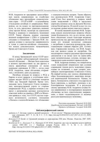 11. Ли И. Советский фактор в военно-техническом сотрудничестве США и КНР в годы холодной войны // Вестник Московского университета. Серия 25: Международные отношения и мировая политика. 2021. Т. 13, № 3. С. 12-47. ;. DOI: 10.48015/2076-7404-2021-13-3-12-47 EDN: KNSSRY