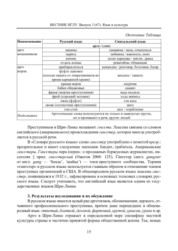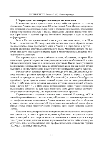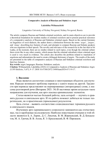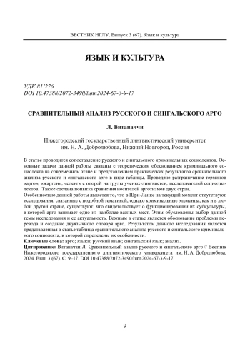В статье проводится сопоставление русского и сингальского криминальных социолектов. Основные задачи данной работы связаны с теоретическим обоснованием криминального социолекта на современном этапе и представлением практических результатов сравнительного анализа русского и сингальского арго в виде таблицы. Проведено разграничение терминов «арго», «жаргон», «сленг» с опорой на труды ученых-лингвистов, исследователей социодиалектов. Также сделана попытка сравнения носителей арготизмов двух стран. Особенностью данной работы является то, что в Шри-Ланке на текущий момент отсутствуют исследования, связанные с подобной тематикой, однако криминальные элементы, как и в любой другой стране, существуют, что свидетельствует о функционировании их субкультуры, в которой арго занимает одно из наиболее важных мест. Этим обусловлены выбор данной темы исследования и ее актуальность. Важным в статье является обоснование проблемы перевода и создание двуязычного словаря арго. Результатом данного исследования является представленная в статье таблица сравнительного анализа русского и сингальского криминального социолекта, в которой определены их особенности.