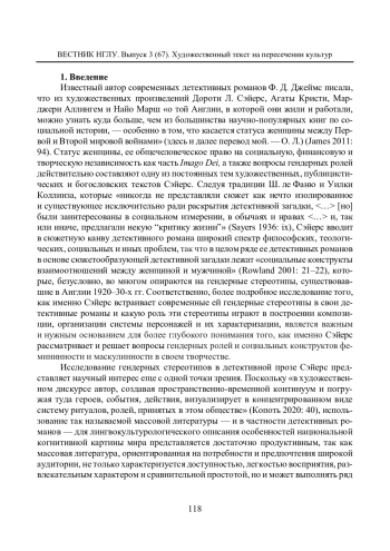 Целью настоящей статьи является изучение гендерных стереотипов в детективной прозе Д. Л. Сэйерс, а также последовательный анализ их функций и способов включения в художественное повествование. Актуальность и новизна исследования обусловлены интересом лингвистов к стереотипам как одному из когнитивных механизмов базовой концептуализации гендера и к языковой актуализации наиболее непрезентативных признаков маскулинности и фемининности в художественном дискурсе, а также общей социально-культурной значимостью вопросов, связанных с гендером, и тем, что творчество Д. Л. Сэйерс остается сравнительно малоизученным в российском литературоведении. С помощью аналитико-описательного и историко-культурного методов, а также контекстного структурно-типологического и структурно-семиотического анализа текста автор анализирует особенности использования гендерных стереотипов в детективной прозе Д. Л. Сэйерс и приходит к выводу, что в детективных романах писательницы гендерные стереотипы используются как в виде прямых дескриптивных и прескриптивных высказываний персонажей относительно гендерных норм и ожиданий, так и в виде контекстуальных гендерных импликатур разного типа, выполняя при этом целый ряд функций. Прежде всего включение гендерных стереотипов в повествование позволяет Сэйерс нарисовать убедительную картину английского социума 1920-30-х гг. и характерный для него сдвиг гендерных ролей и ожиданий в сторону нового понимания маскулинности и фемининности. Кроме того, включение гендерных стереотипов во внутреннюю и внешнюю речь героев позволяет Сэйерс дать им более развернутую и сложную характеризацию и выстроить систему персонажей, не только играя с типичными для детективного жанра нарративными шаблонами, выстроенными на основе упрощенной биполярной дихотомии между мужчинами и женщинами, но и обозначая параллели и конфликты между персонажами в зависимости от их многообразного и противоречивого отношения к гендерным стереотипам. Закладывая традиционные гендерные стереотипы в сюжетную основу одного из своих романов, Сэйерс поднимает целый ряд социальных, философских и богословских проблем, отражая меняющиеся нормы британского общества и размышляя о подлинно христианском понимании гендерных различий и ролей. Решая гендерный вопрос в русле характерной для ее творчества «субверсивной ортодоксии», Сэйерс постулирует важность подлинно равных и гармоничных взаимоотношений между мужчинами и женщинами и в образах своих протагонистов воплощает свою интерпретацию библейского взгляда на маскулинность / фемининность и связанные с ними гендерные нормы и ожидания.