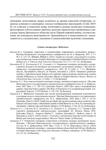 1. Бакулин М. А. Гендерные стереотипы в концептосфере современного детективного романа // Вестник Костромского государственного университета им. Н. А. Некрасова. 2011. Т. 17. № 3. С. 127-131. EDN: OYCYJL
