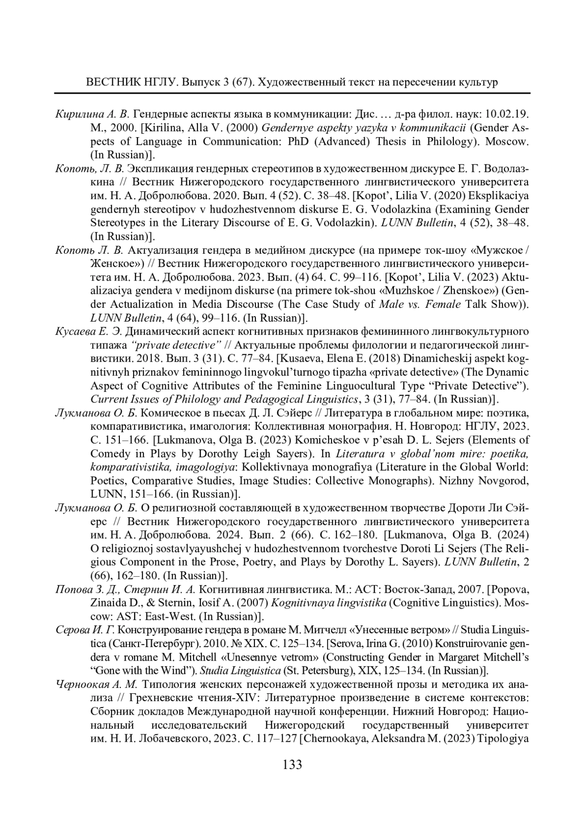 8. Копоть, Л. В. Экспликация гендерных стереотипов в художественном дискурсе Е. Г. Водолазкина // Вестник Нижегородского государственного лингвистического университета им. Н. А. Добролюбова. 2020. Вып. 4 (52). С. 38-48. EDN: KTHHZF