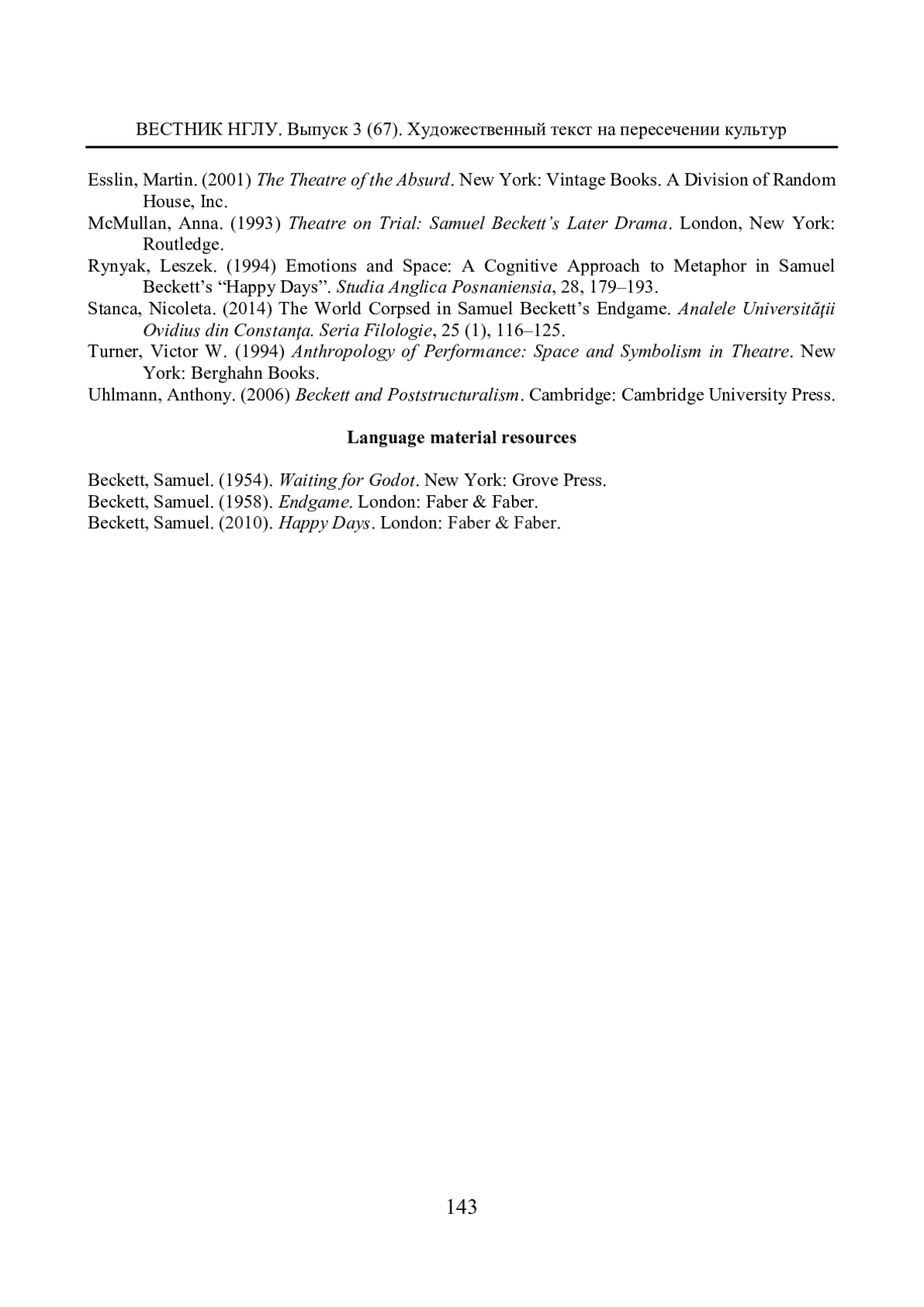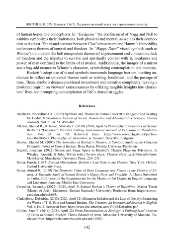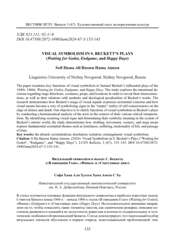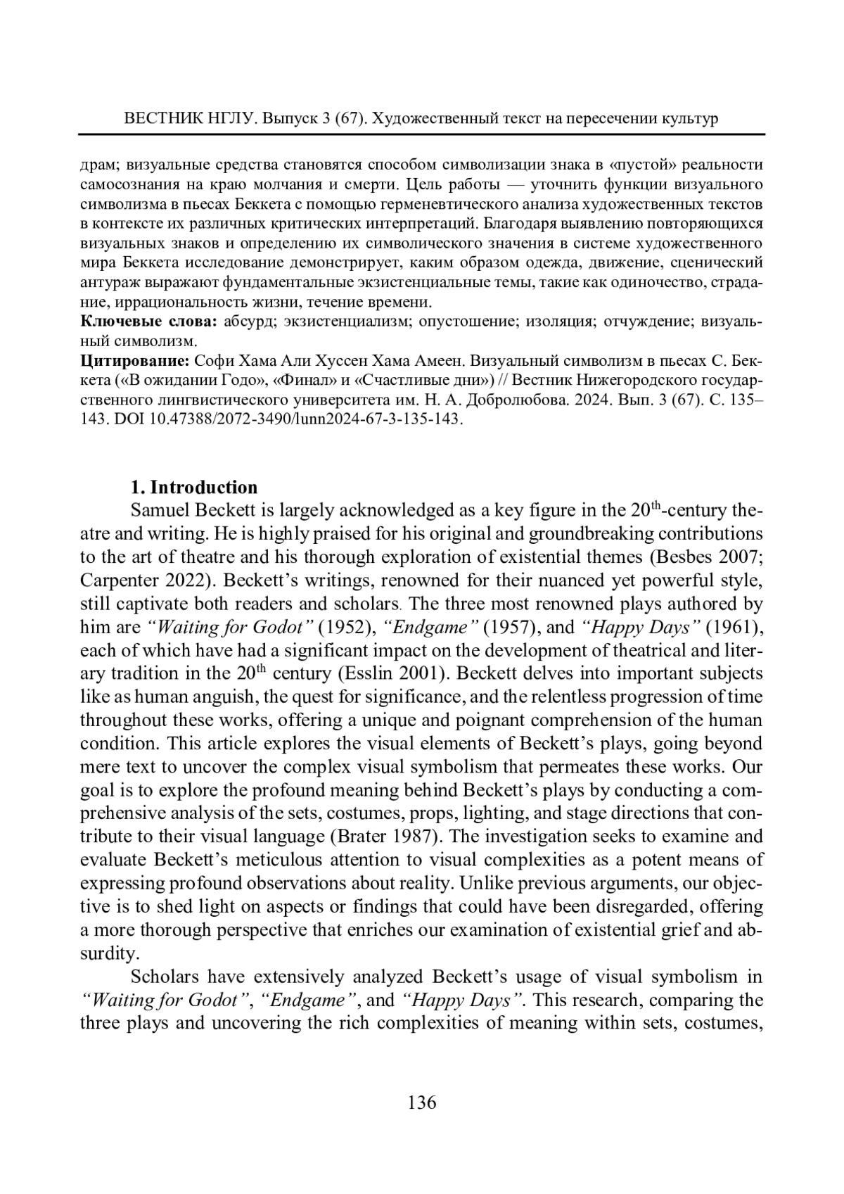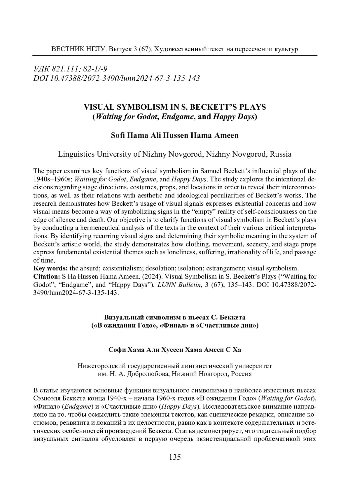 СОФИ Х. А. ВИЗУАЛЬНЫЙ СИМВОЛИЗМ В ПЬЕСАХ С. БЕККЕТА ("В ОЖИДАНИИ ГОДО", "ФИНАЛ" И "СЧАСТЛИВЫЕ ДНИ") // ВЕСТНИК НИЖЕГОРОДСКОГО ГОСУДАРСТВЕННОГО ЛИНГВИСТИЧЕСКОГО УНИВЕРСИТЕТА ИМ. Н. А. ДОБРОЛЮБОВА. 2024. № 67