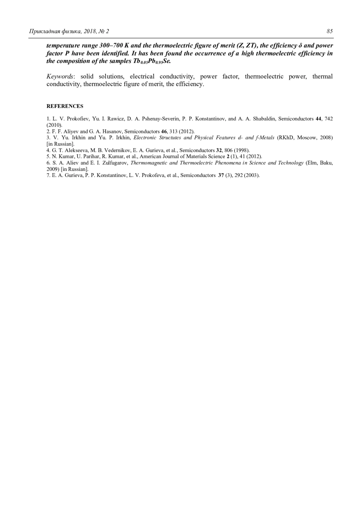 7. Гуриева Е. А., Константинов П. П., Прокофьева Л. В., Равич Ю. И., Федоров И. М. // ФТП. 2003. Т. 37. Вып. 3. С. 292.